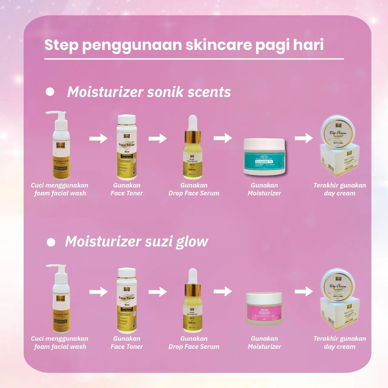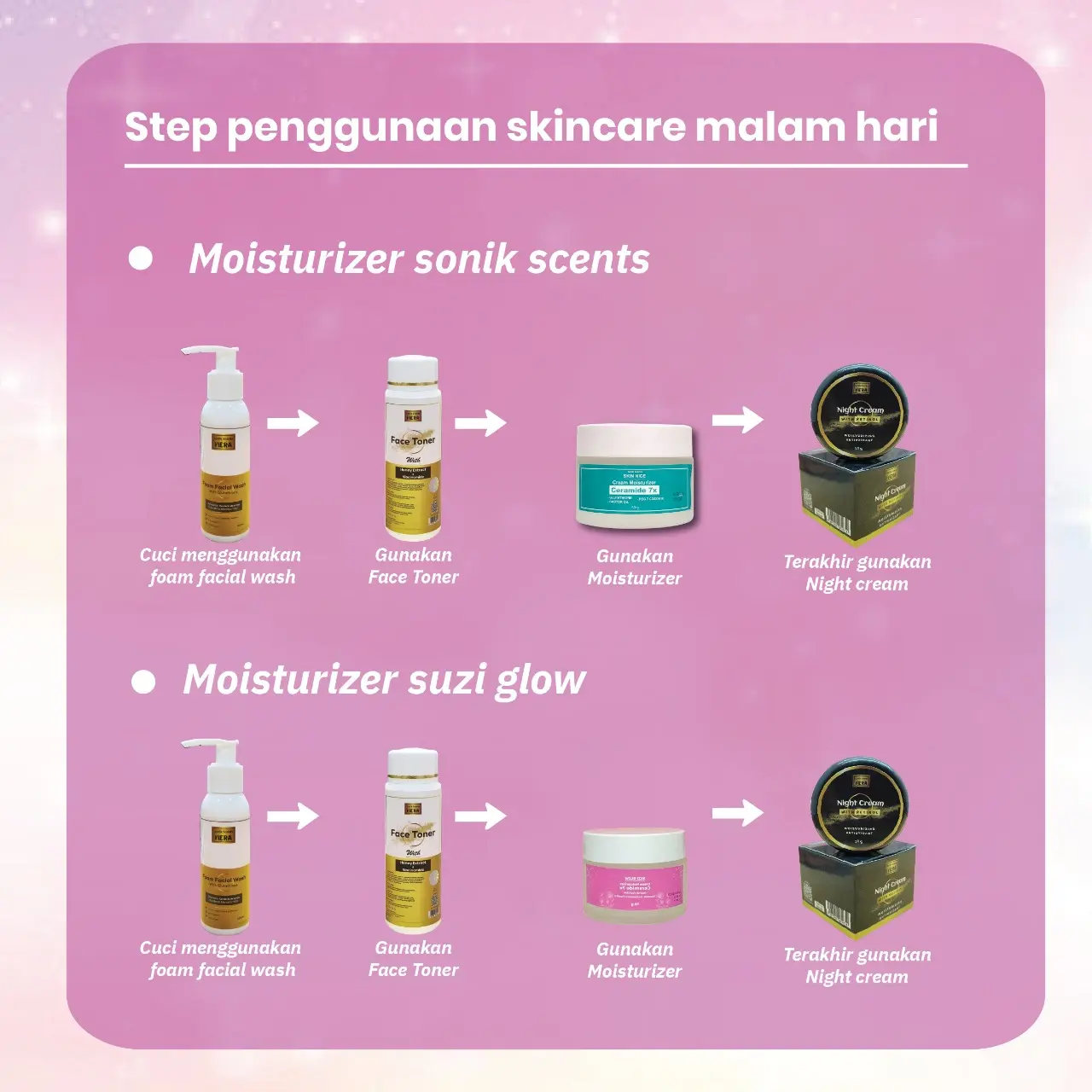 lanjut dengan menggunakan Moisturizer, Keluarkan produk secukupnya untuk dibalur ke seluruh wajah & leher Pastikan tangan bersih sebelum di tepuk-tepuk ke wajah yang sudah bersih & kering, lalu biarkan produk menyerap,Dapat digunakan setiap hari (pagi & malam) sebelum penggunaan day cream dan night cream