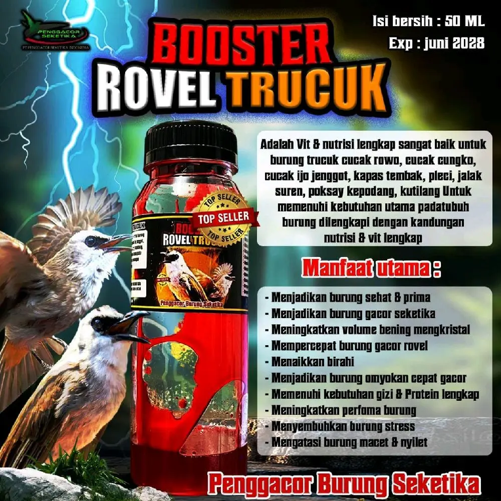 BOOSTER ROVEL TRUCUK merupakan suplemen yang diformulasikan khusus untuk meningkatkan performa burung, khususnya jenis trucuk, cucak rowo, cucak cungko, cucak ijo jenggot, kapas tembak, pleci, jalak suren, poksay, kepodang, dan kutilang. Produk ini dirancang untuk memenuhi kebutuhan nutrisi dan vitamin esensial burung, dengan tujuan untuk mengoptimalkan kesehatan dan kemampuan berkicau mereka secara instan. Kandungan lengkap dalam suplemen ini diharapkan dapat memberikan dampak positif terhadap vitalitas dan performa burung peliharaan.