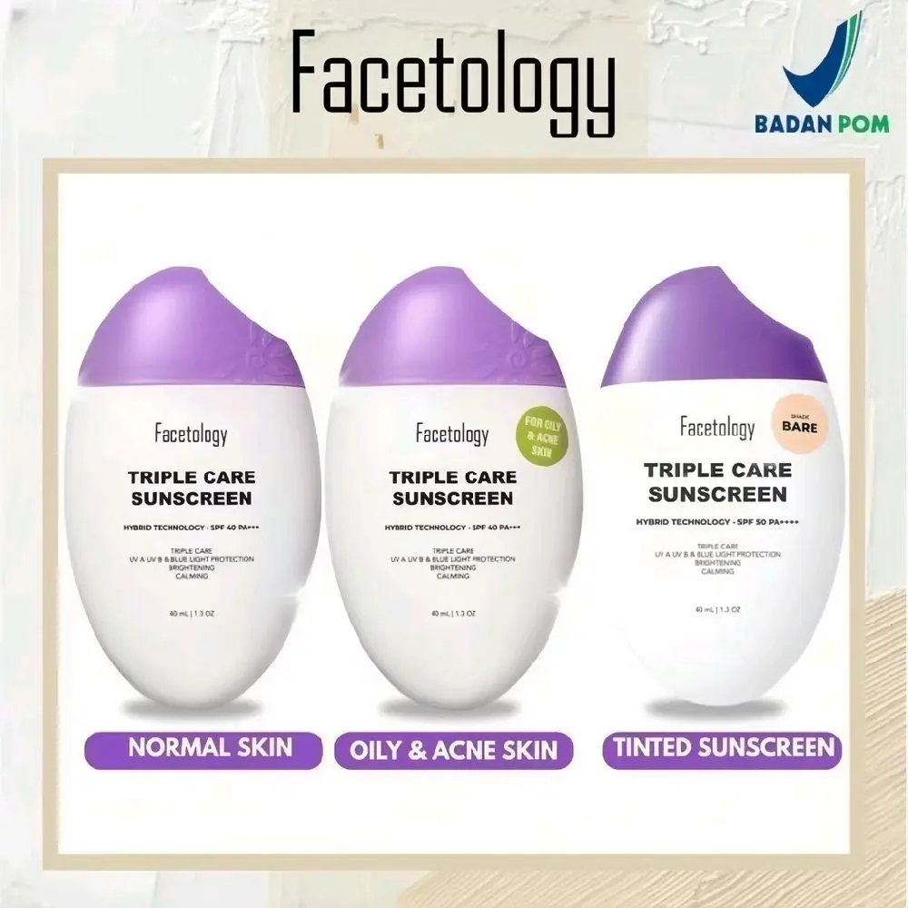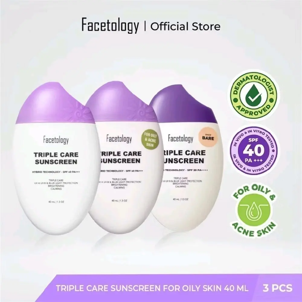 Gunakan FACETOLOGY TRIPLE CARE SUNSCREEN untuk perlindungan matahari sepanjang hari. Cocok untuk kulit berminyak yang membutuhkan perlindungan tambahan.