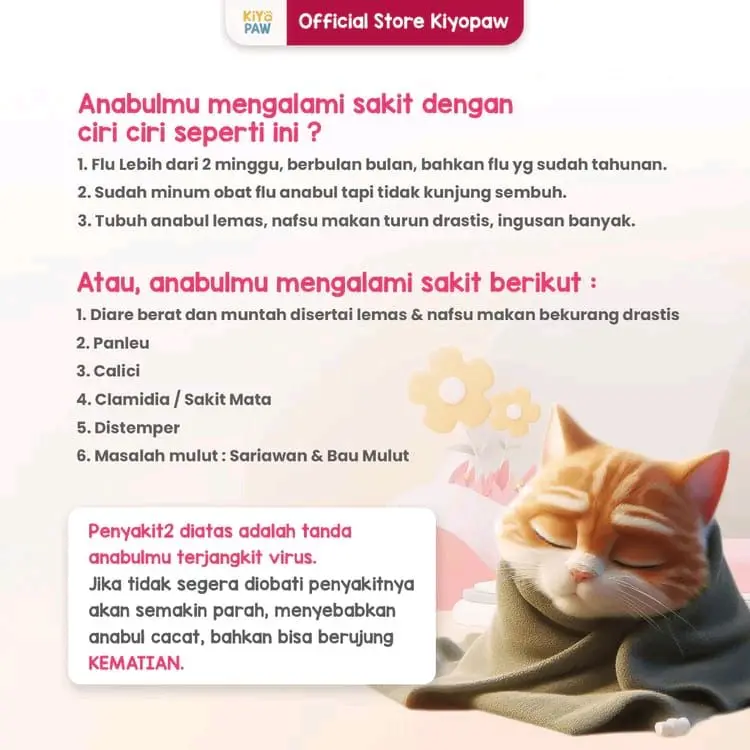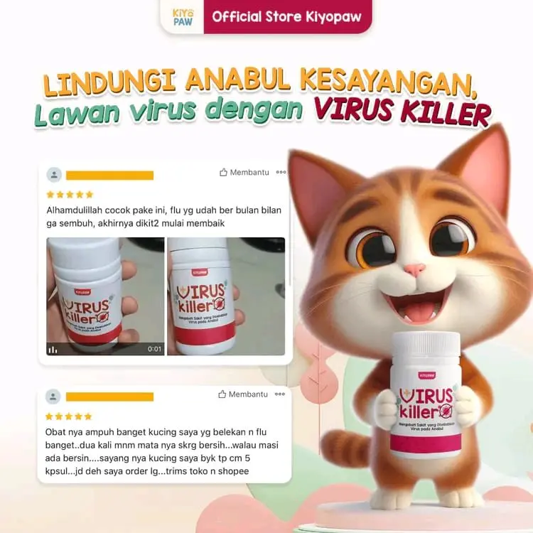 Flu Anabul dgn ciri diatas menandakan anabul terjangkit virus bukan flu biasa. Maka disarankan diberikan VIRUS KILLER untuk membunuh virus di dalam tubuh anabul.