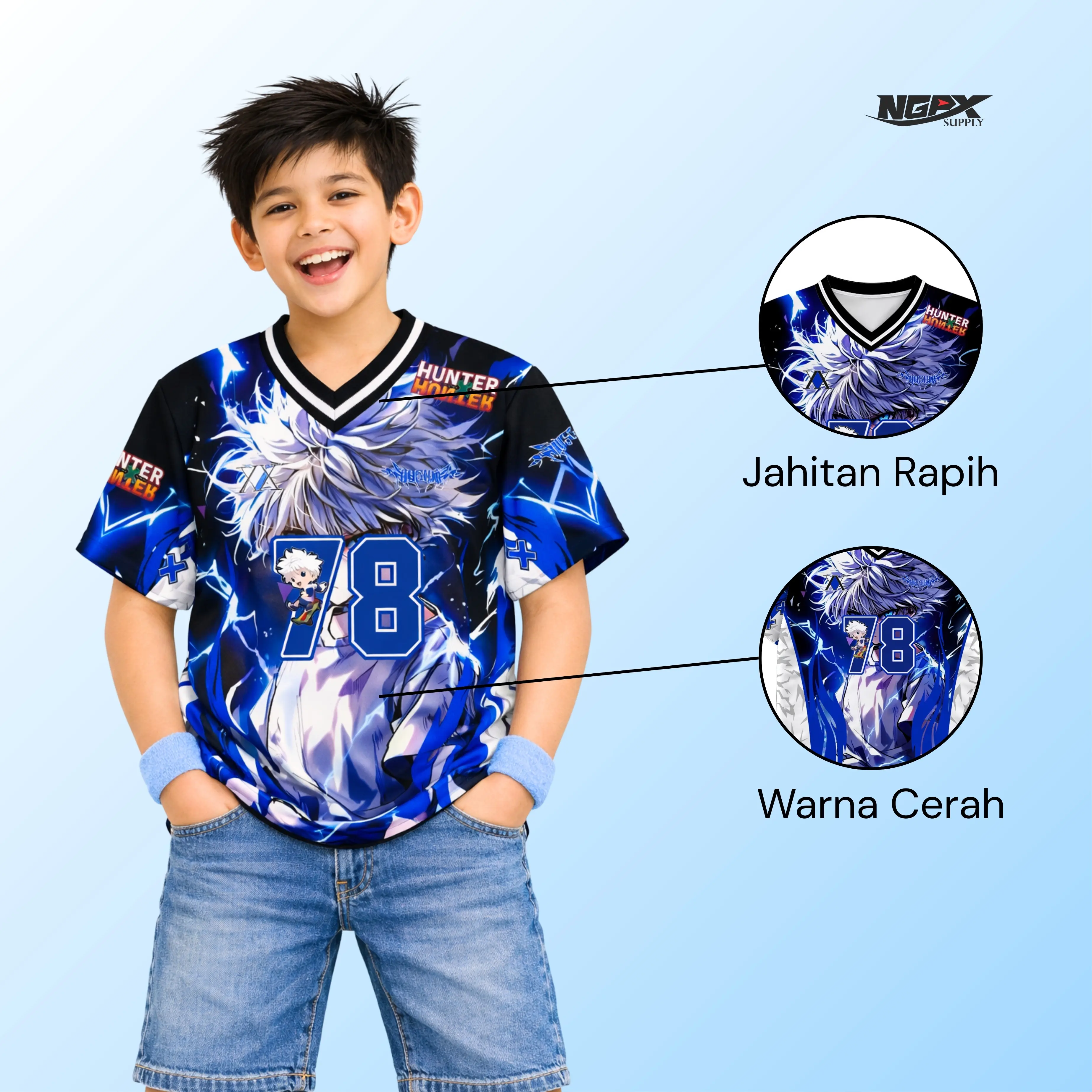Bikin si kecil makin pede dan nyaman beraktivitas dengan Jersey Killua HxH Biru dari NGPX!