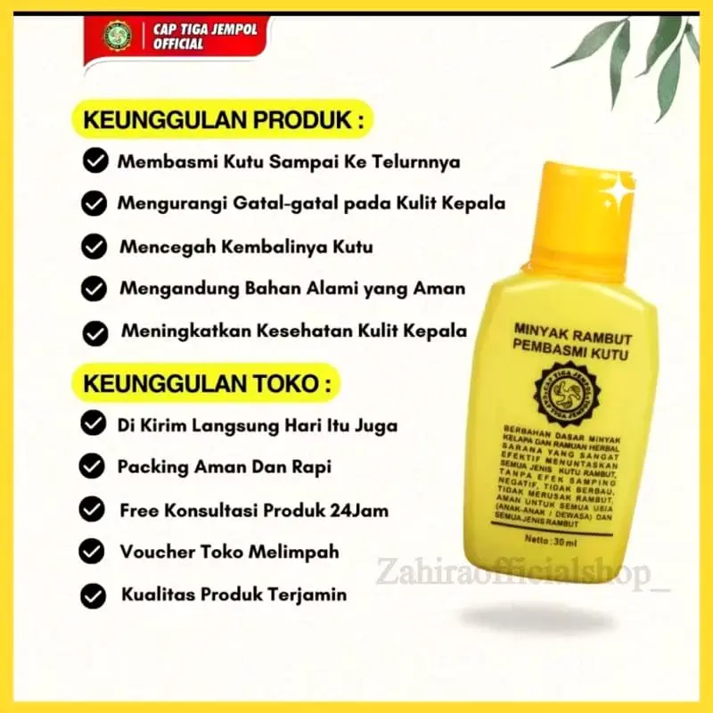 Cap Tiga Jempol adalah ramuan herbal berbahan minyak kelapa. Sangat efektif menghilangkan kutu rambut hingga ke telurnya. Aman untuk semua usia, termasuk anak-anak dan ibu hamil. Tidak berbau dan tidak merusak rambut. Menutrisi rambut secara alami.