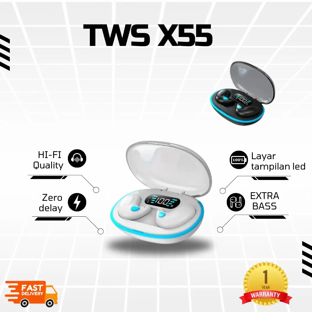 β¨ X55 TWS Headset adalah earphone Bluetooth nirkabel yang tak terlihat. Dilengkapi dengan layar LED, headset ini menawarkan kualitas suara Hi-Fi dengan extra bass. Fitur pengurang kebisingan dan kait telinga membuatnya cocok untuk touring.