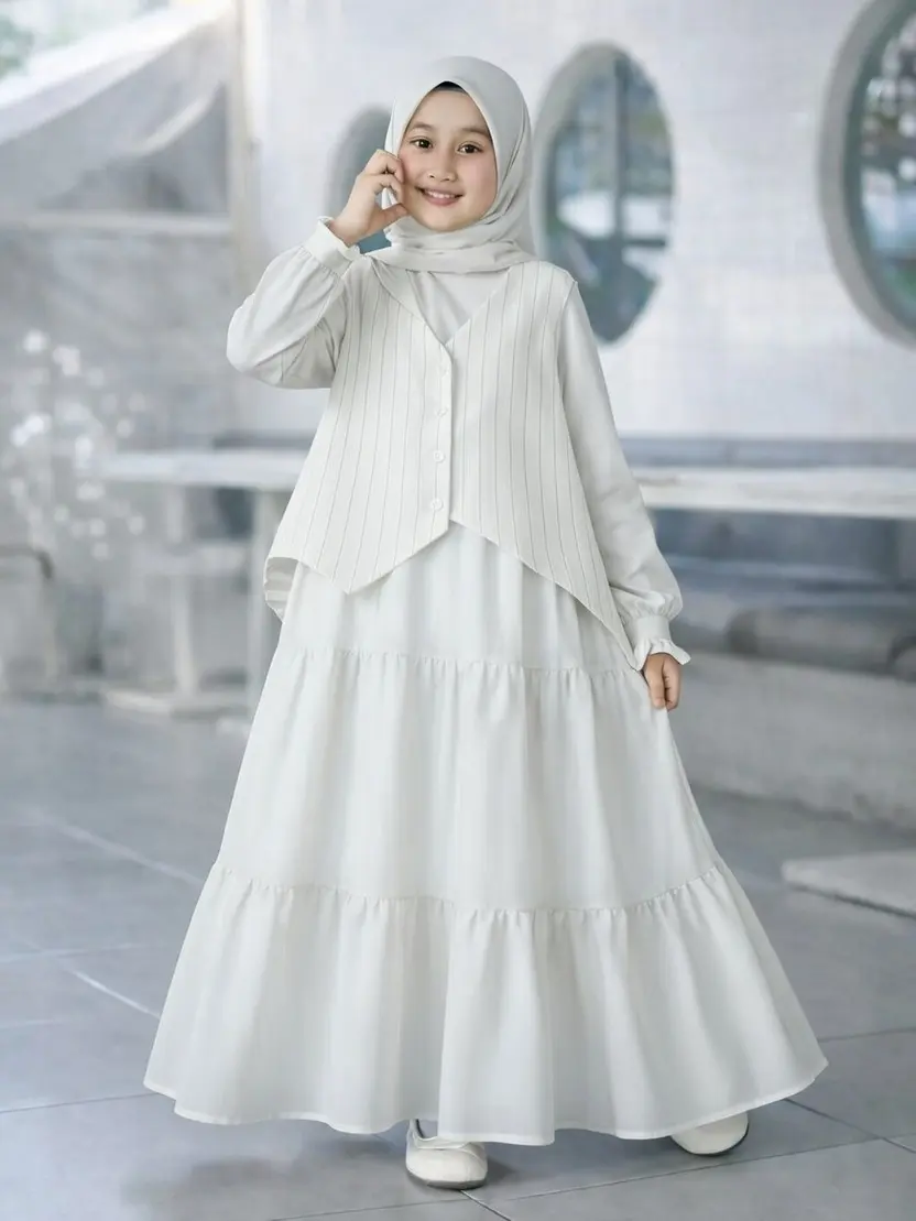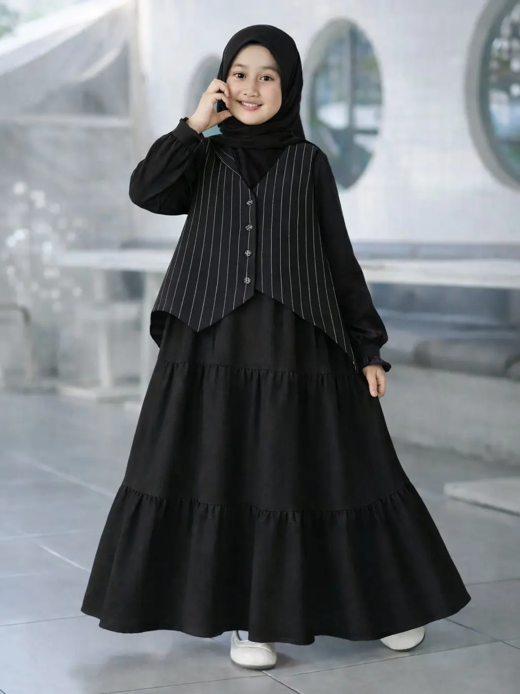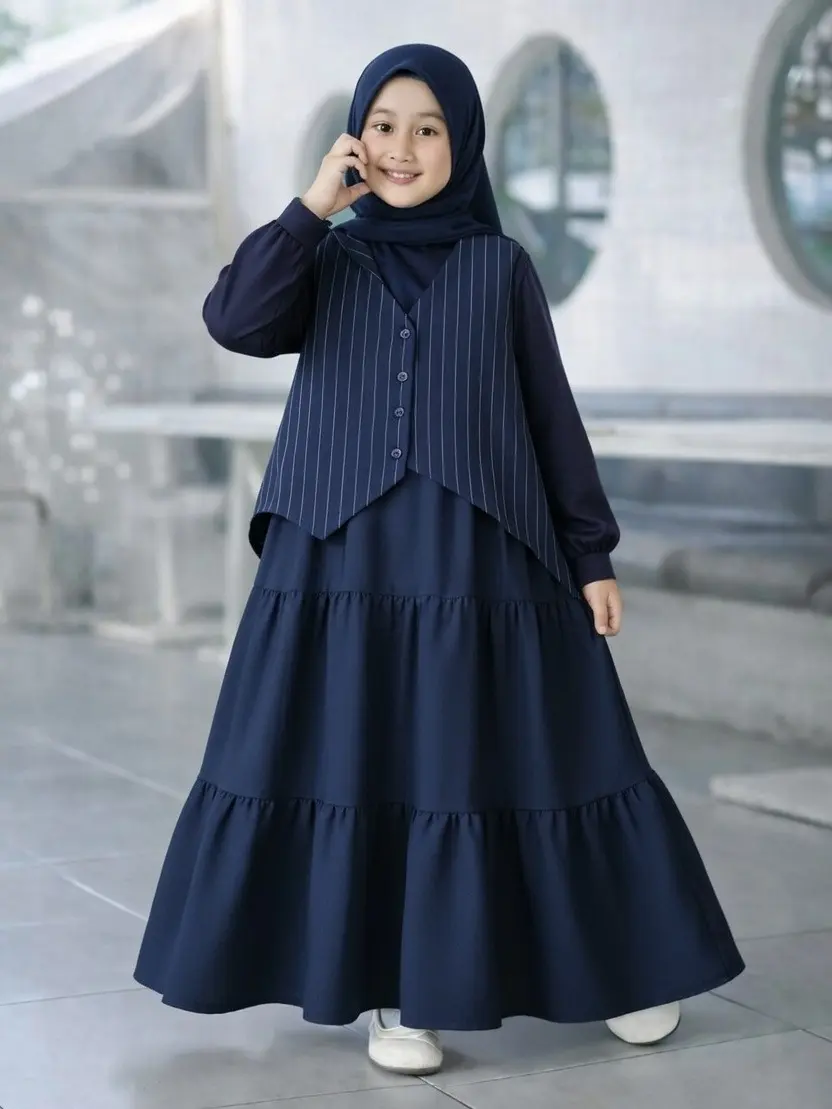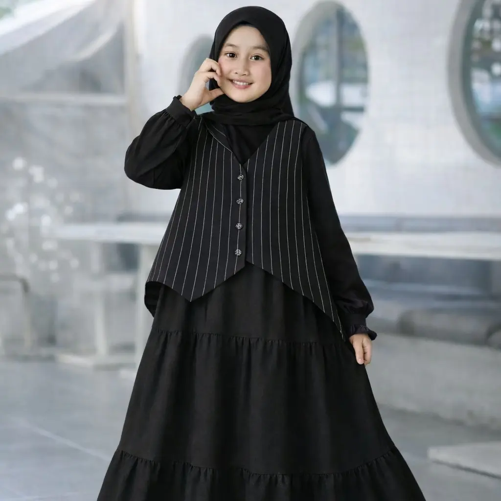 Gamis ini adalah pilihan tepat untuk Lebaran Anda. Tampil cantik dan nyaman dengan Gamis Anak Premium Stripe Vest Outer Syari.