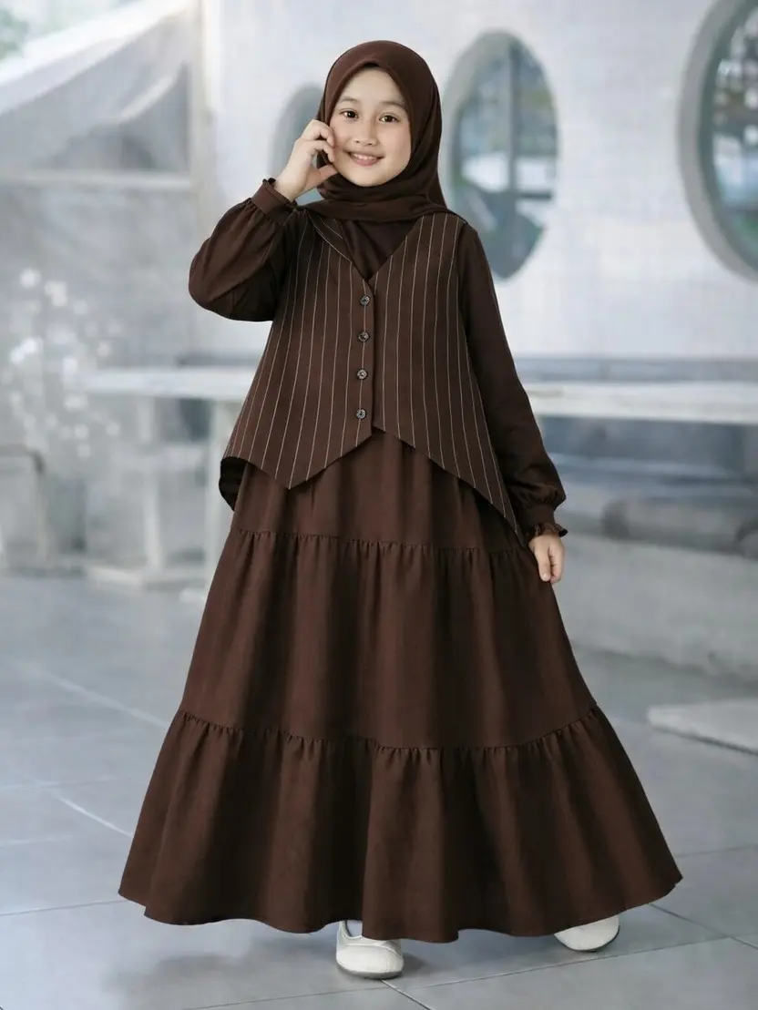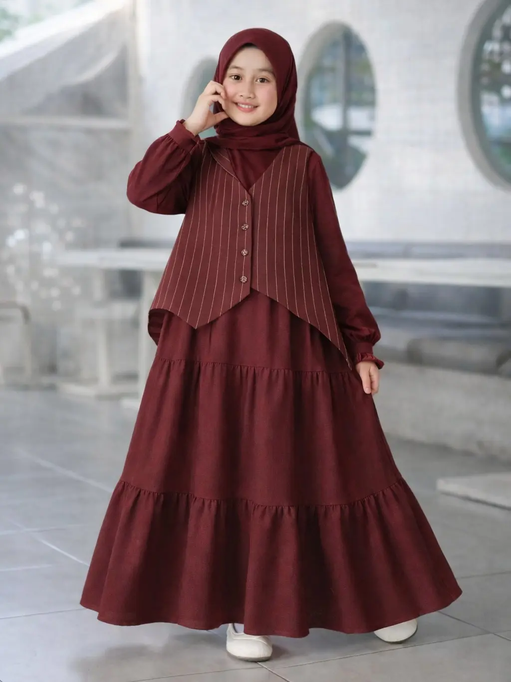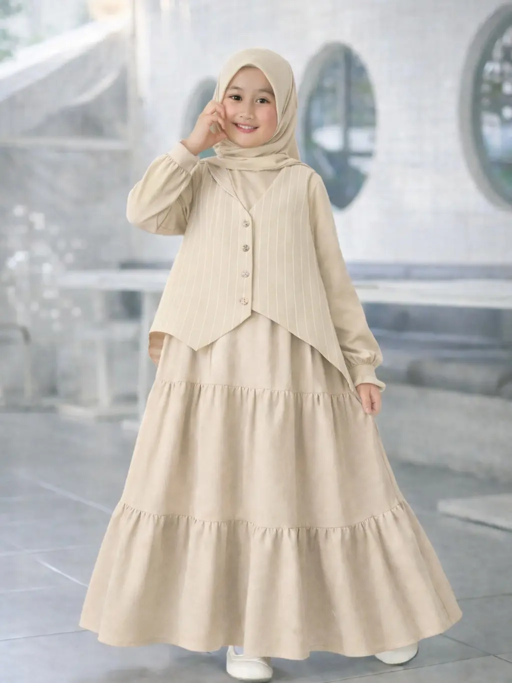 Gamis ini adalah pilihan tepat untuk Lebaran Anda. Tampil cantik dan nyaman dengan Gamis Anak Premium Stripe Vest Outer Syari.