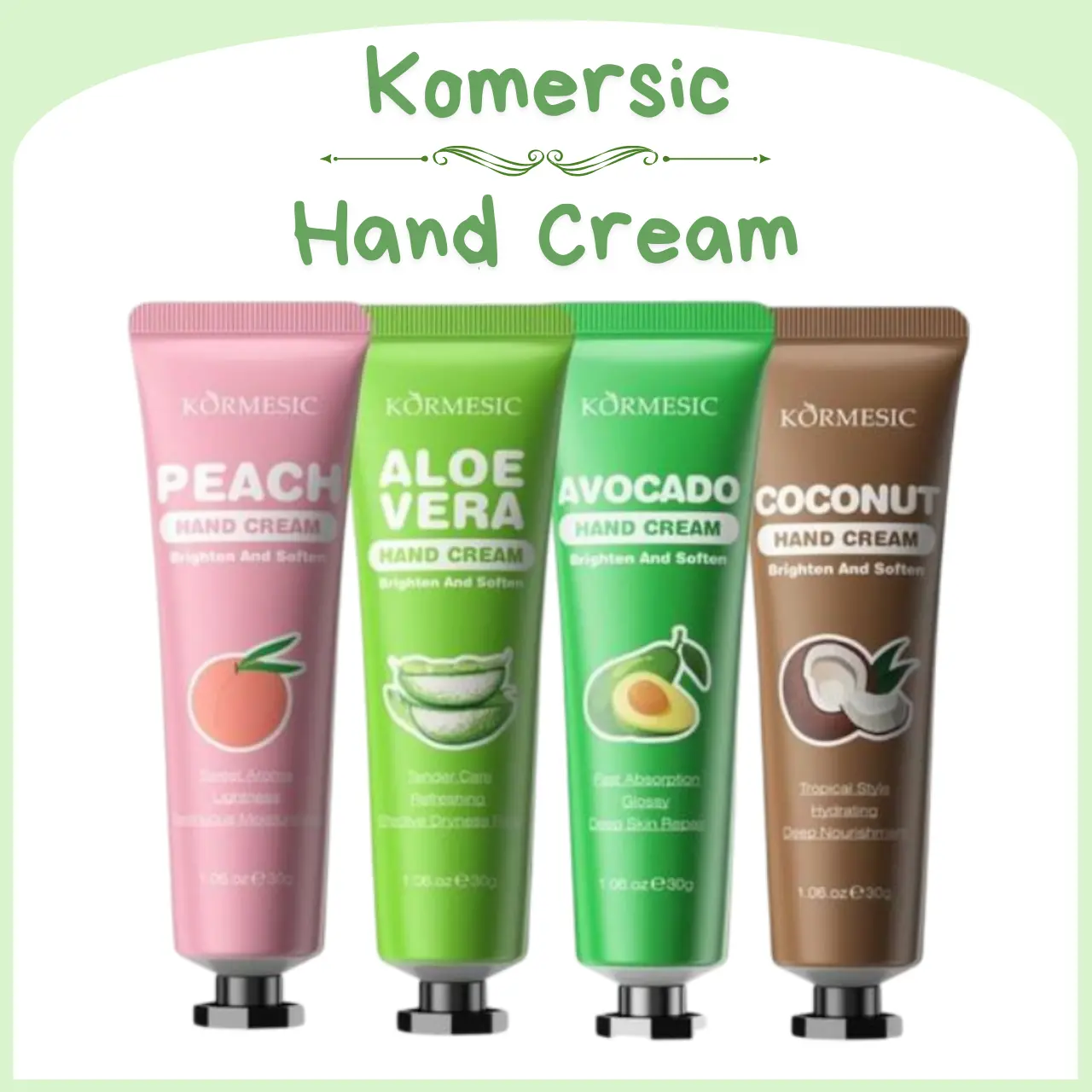 Nikmati sentuhan lembut dan hidrasi intens dari KORMESIC Hand Cream dengan 4 pilihan varian alami: Coconut, Aloe Vera, Avocado, dan Peach. Formula ringan yang cepat meresap, tidak lengket, dan memberikan kelembapan sejak sentuhan pertama. Cocok untuk semua jenis kulit, esensial di meja kerja, di tas saat commuting, atau sebagai perawatan setelah cuci tangan – tangan selalu terasa halus, terhidrasi, dan siap beraktivitas dengan percaya diri!