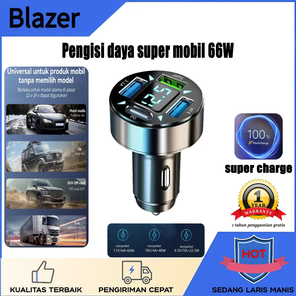 5. Blazer 66W Charger Mobil Super Cepat - 3 USB + 1 Port PD, Universal dengan Display Digital, Cocok untuk Semua Mobil (SUV, Jeep, Truk) - Pengisian Kilat & Monitor Baterai