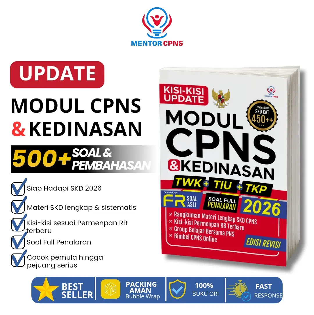 Persiapkan langkah terbaik menuju CPNS dan Sekolah Kedinasan 2026 dengan MODUL SKD CPNS DAN KEDINASAN 2026! Disusun lengkap, praktis, dan sesuai update terbaru, siap mendampingi perjuanganmu meraih cita-cita Jadi Abdi Negara. Buku original hanya tersedia di Toko Mentor CPNS! Pastikan kamu membeli buku original untuk bisa klaim semua bonus yang ada. Ikuti cara klaim yang terdapat pada buku halaman vi.
