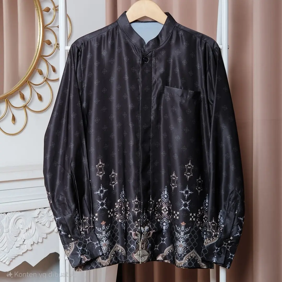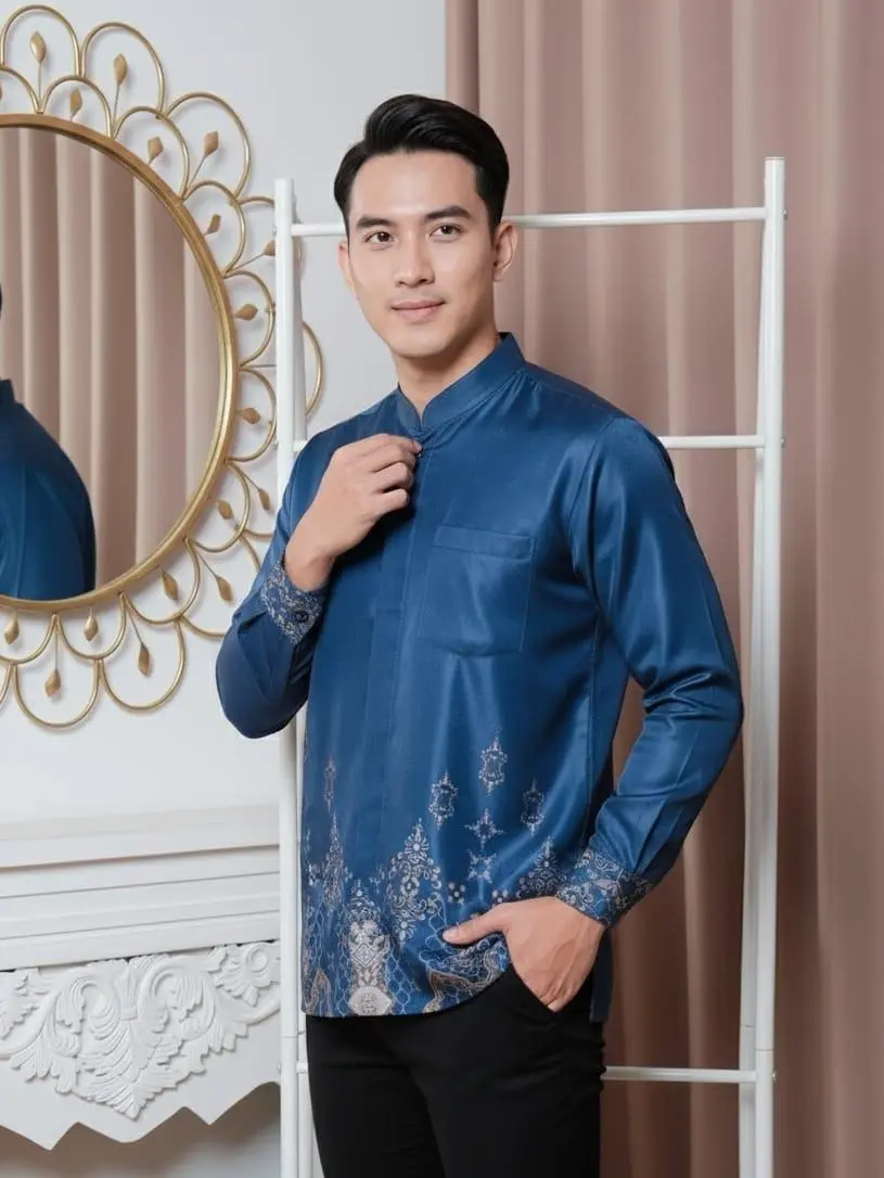 Bagian kerah dibuat dengan model tegak modern yang memberikan kesan tegas dan berwibawa, sementara motif etnik pada bagian dada dan pergelangan tangan menambah sentuhan artistik yang khas. Warna-warna yang digunakan pun dipilih dengan cermat — lembut namun berkarakter, memancarkan aura elegan dan percaya diri bagi siapa pun yang mengenakannya.