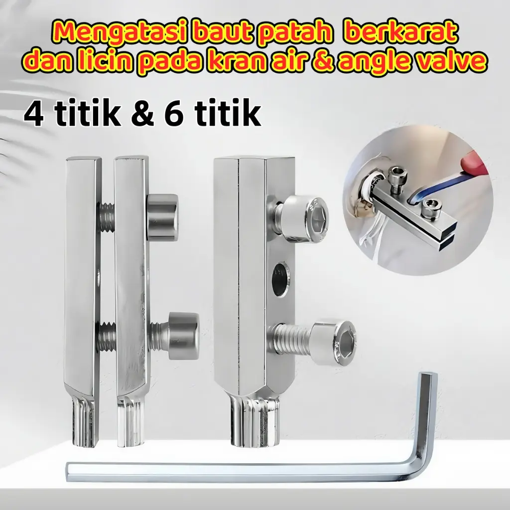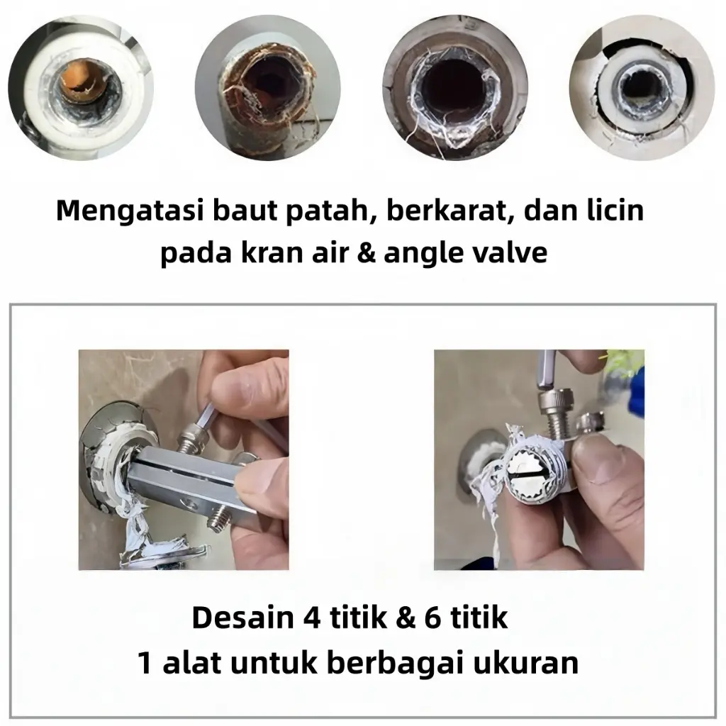 Alat ini dirancang khusus untuk membuka baut kran air atau angle valve yang patah, berkarat, atau licin. Dengan desain 4 titik & 6 titik yang dapat disesuaikan, alat ini memudahkan pelepasan baut tanpa merusak pipa. Cocok untuk penggunaan rumah tangga maupun teknisi.