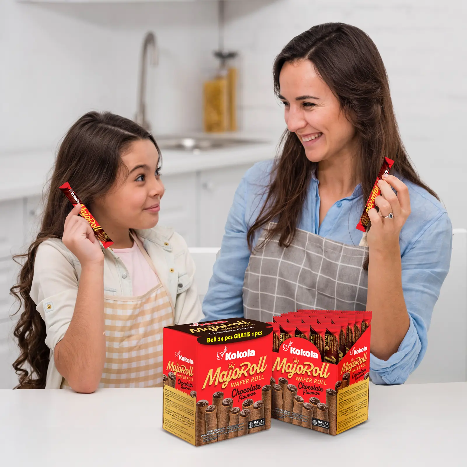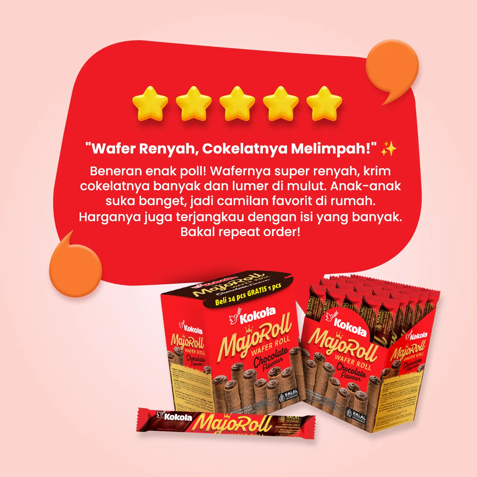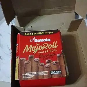 Wafer roll cokelat renyah berpadu krim cokelat lembut yang lumer di mulut. Cocok untuk semua kalangan, dari anak-anak sampai dewasa!