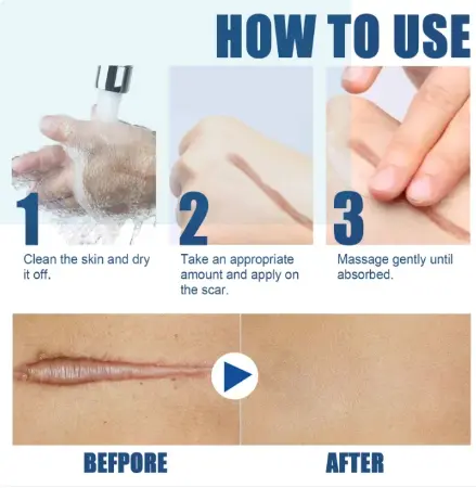 Ambil cream dalam jumlah yang sesuai dan oleskan secara merata pada bekas luka, oleskan perlahan dengan jari selama 3-5 menit, sampai kulit atau jaringan bekas benar-benar terserap, setiap kali oleskan 3 kali, setiap hari 2-3 kali.