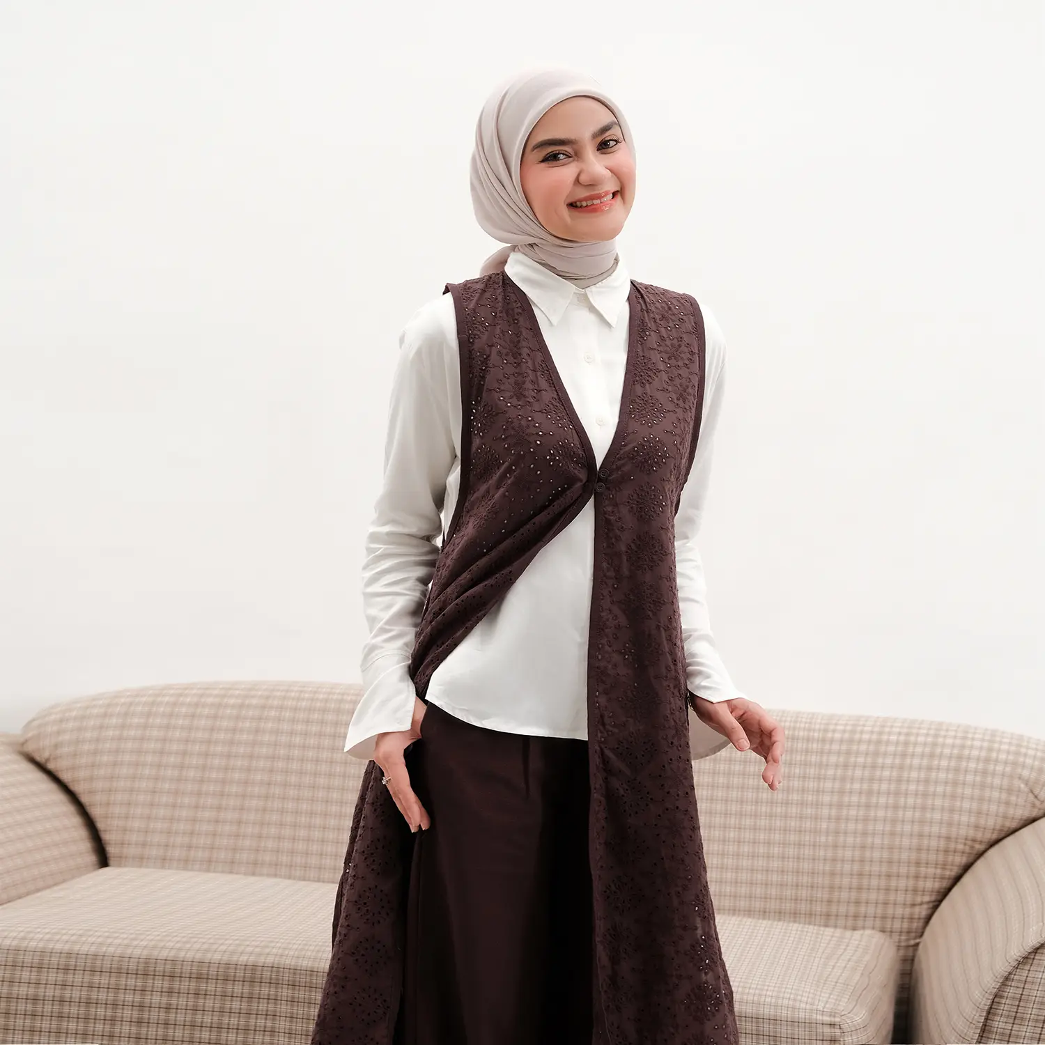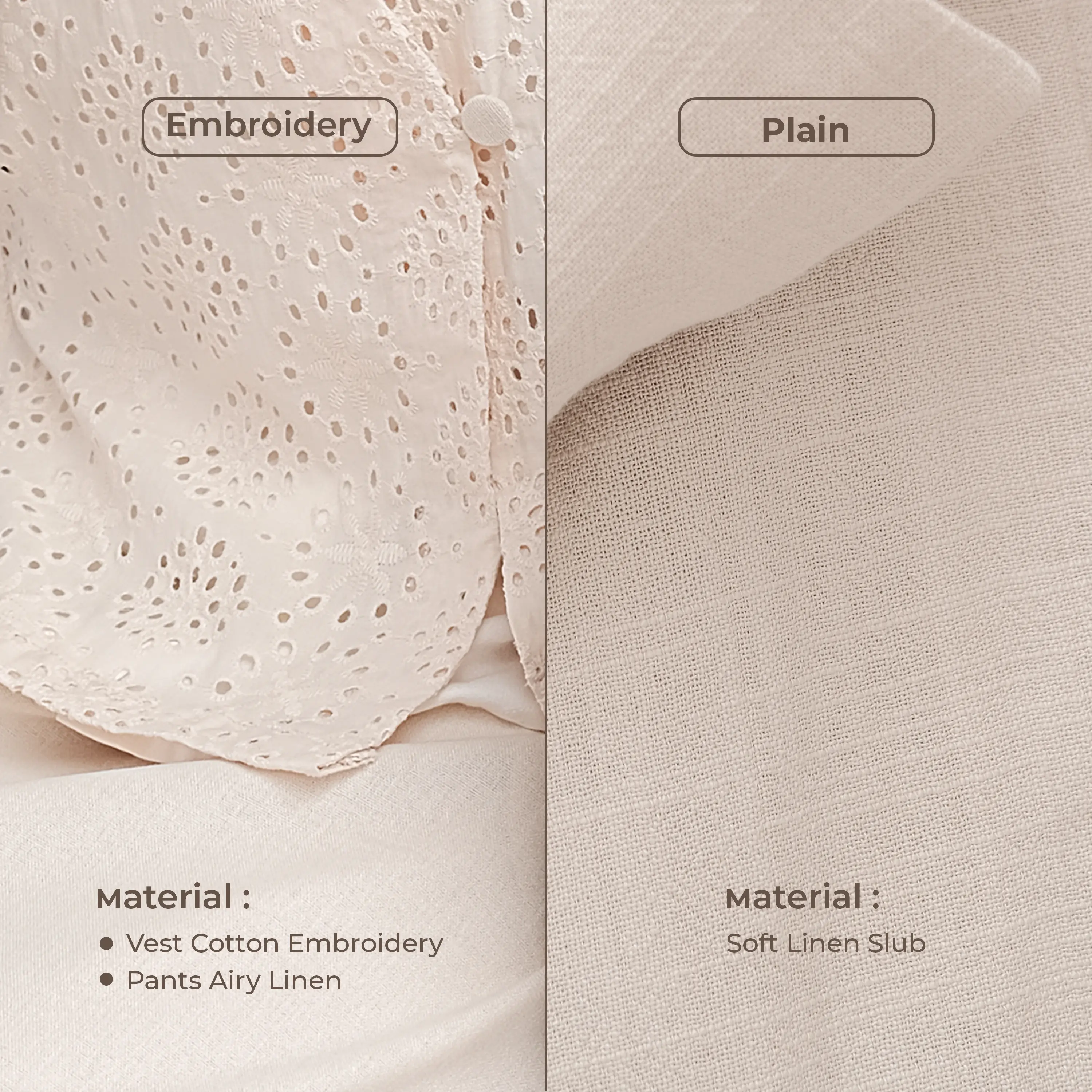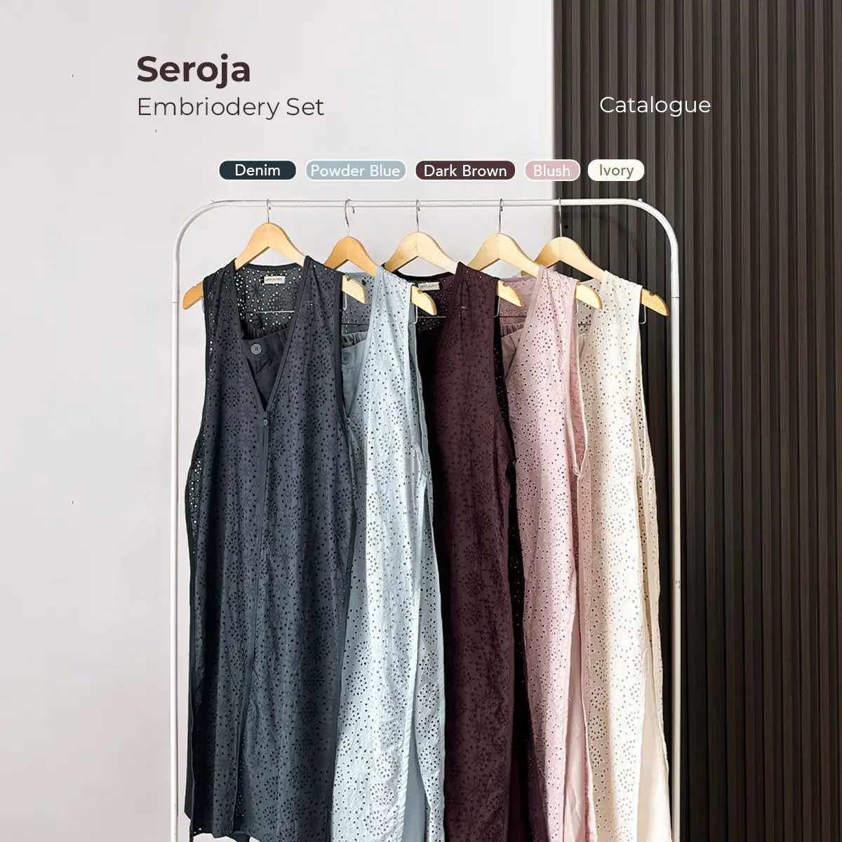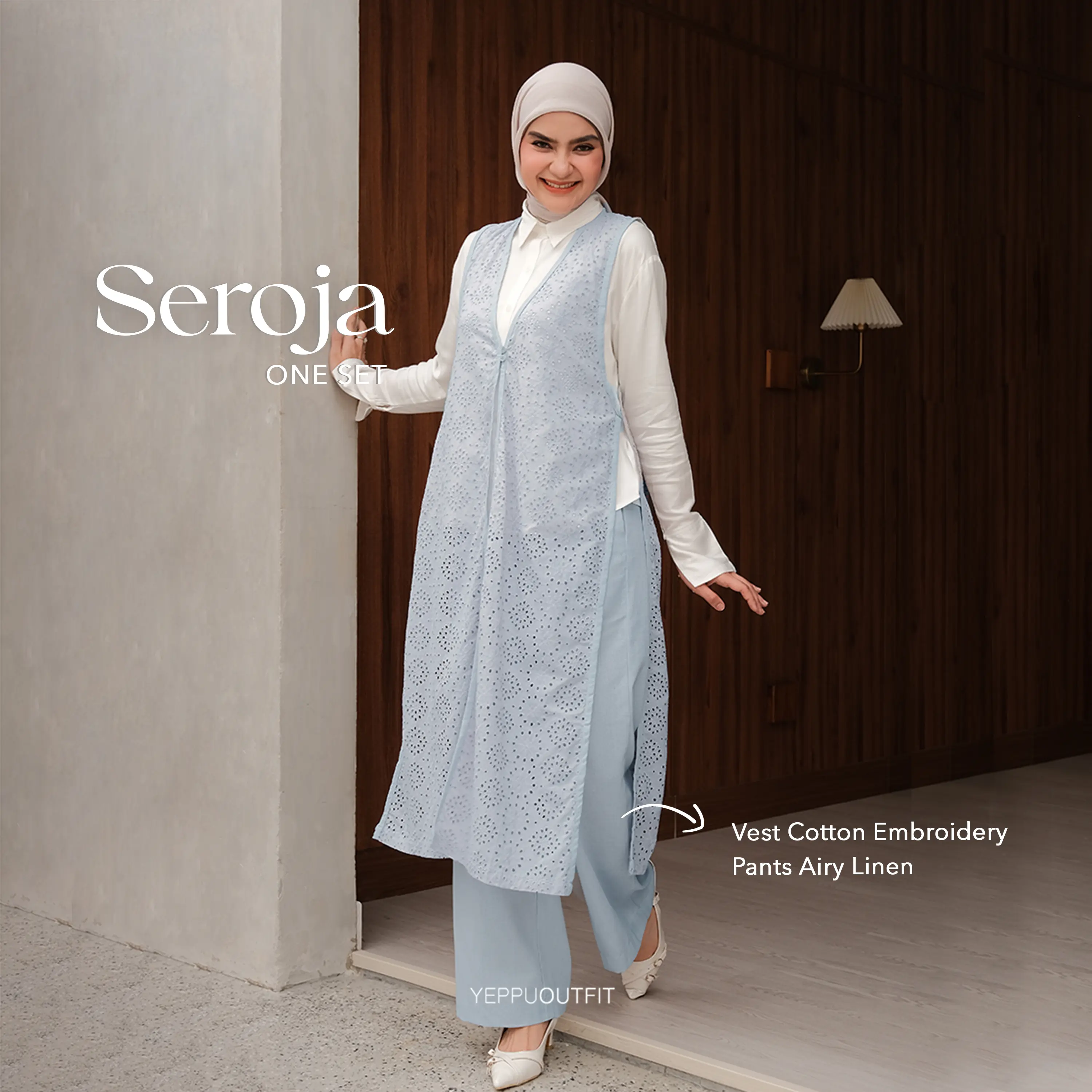 • Seroja Plain Volume 2 — Memiliki material Soft Linen Slub dengan karakteristik khas linen yang lembut dan berkarakter. Bahan ini tebal dan anti nerawang tapi tetap adem dipakai lebaran. Design vest panjangnya plain dengan bawahan celana highwaist yang lebih casual dan easy to match untuk acara special dan bisa dipakai daily juga.