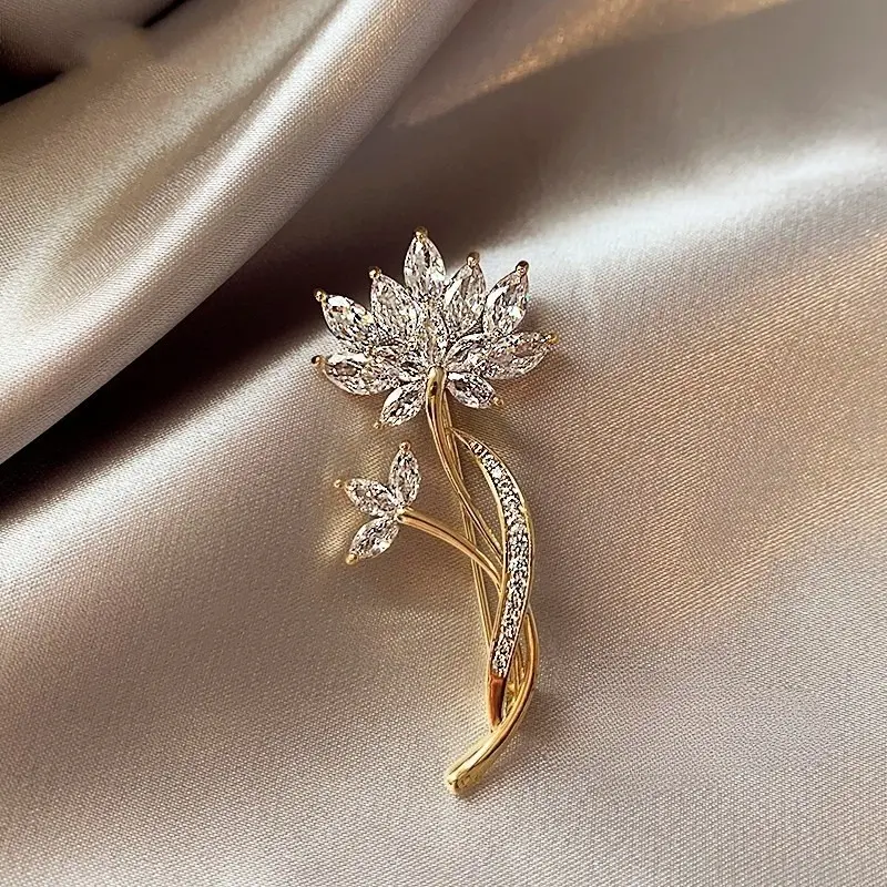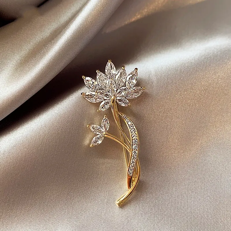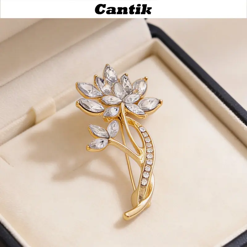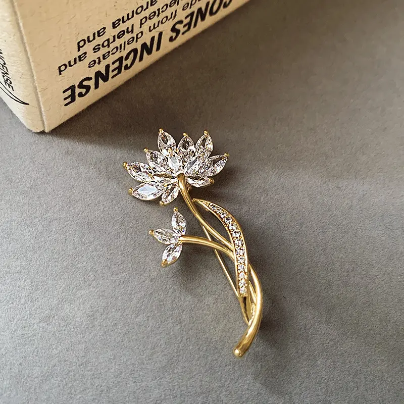 [Cantik]Bros Teratai Kristal Cabang Emas untuk Wanita, Aksesoris Pin Tudung B1177