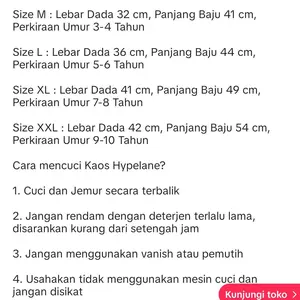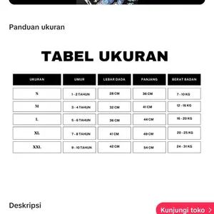 Size XXL : Lebar Dada 42 cm, Panjang Baju 54 cm, Perkiraan Umur 9-10 Tahun