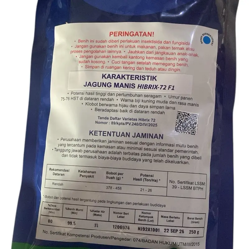 Benih jagung manis Hibrix-72 F1 dari Advanta hadir dalam berat 250 gram. Produk ini cocok untuk kebutuhan pertanian Anda. Benih ini dikenal sebagai benih jagung manis, sehingga memberikan hasil panen yang lezat.