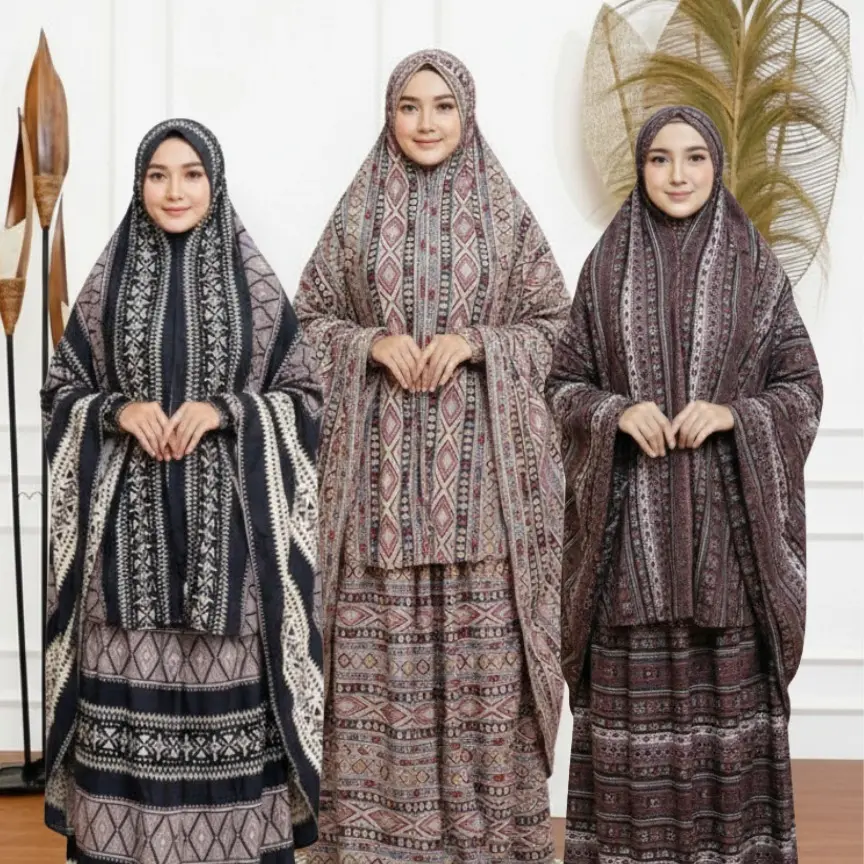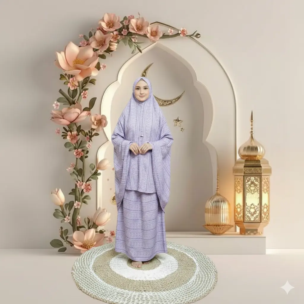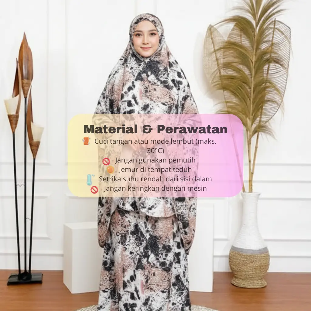 Mukena dewasa rayon viscose premium model 2 in 1 bahan kain yang ringan, adem, dan lembut di kulit.