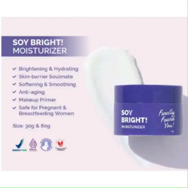 ✨ Soy Bright! Moisturizer - Produk ini dirancang untuk memberikan kelembapan dan mencerahkan kulit. Ia juga berfungsi sebagai teman kulit yang melindungi dan melembutkan kulit. Cocok sebagai primer makeup, produk ini aman untuk ibu hamil dan menyusui. Tersedia dalam ukuran 30g dan 80g.