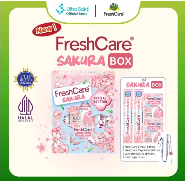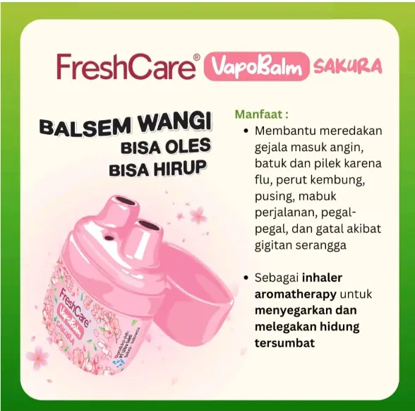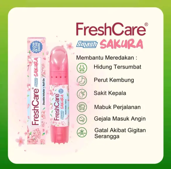 Freshcare Smash Double Inhaler dengan aroma sakura ini adalah solusi praktis untuk berbagai masalah kesehatan sehari-hari. Produk ini membantu meredakan perut kembung, pusing, gejala masuk angin, mabuk perjalanan, pegal-pegal, dan gatal akibat gigitan serangga.