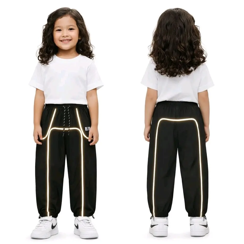 Celana baggy pants track pants anak berbahan DESPO PREMIUMΒ ringan adem dan nyaman dipakai seharianΒ Dilengkapi piping reflektif paling terang, cocok untuk aktivitas sore sampai malam hari Model longgar sporty dan kekinianΒ