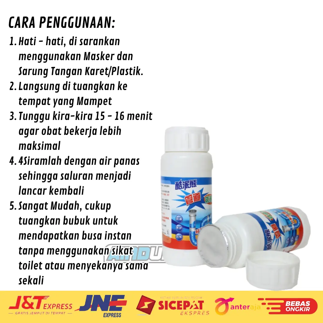 - Masukkan powder dalam sink and drain cleaner secukupnya (40 gr untuk saluran pipa wastafel / bak cuci yang, 200 gr atau lebih di toilet dan pipa yang besar), tuangkan ke dalam pipa setelah lima menit kemudian guyur dengan air bersih yang hangat secukupnya.