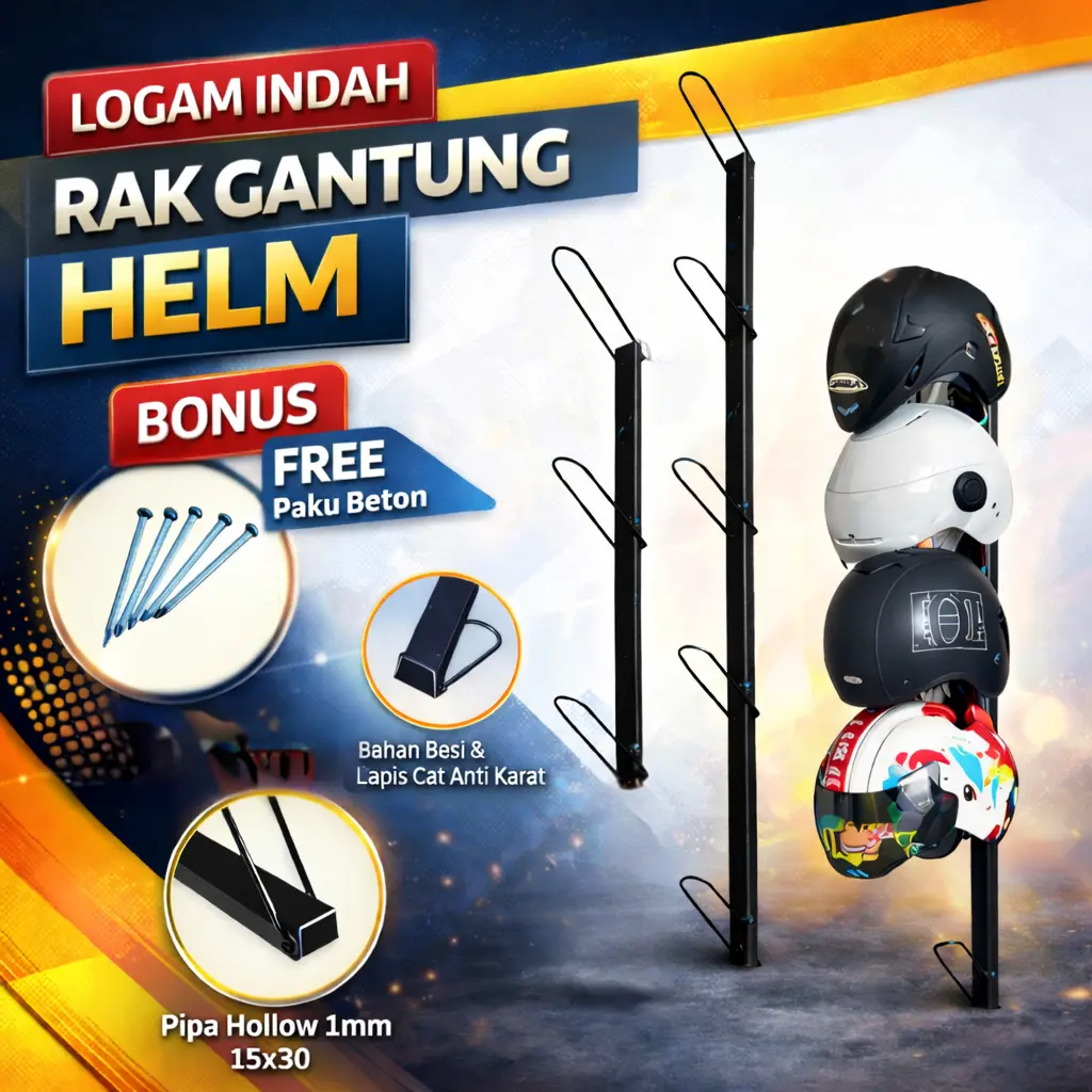• Desain Vertikal Bertingkat – Tersedia pilihan 3 susun dan 5 susun. Cocok untuk menyimpan banyak helm tanpa makan tempat.