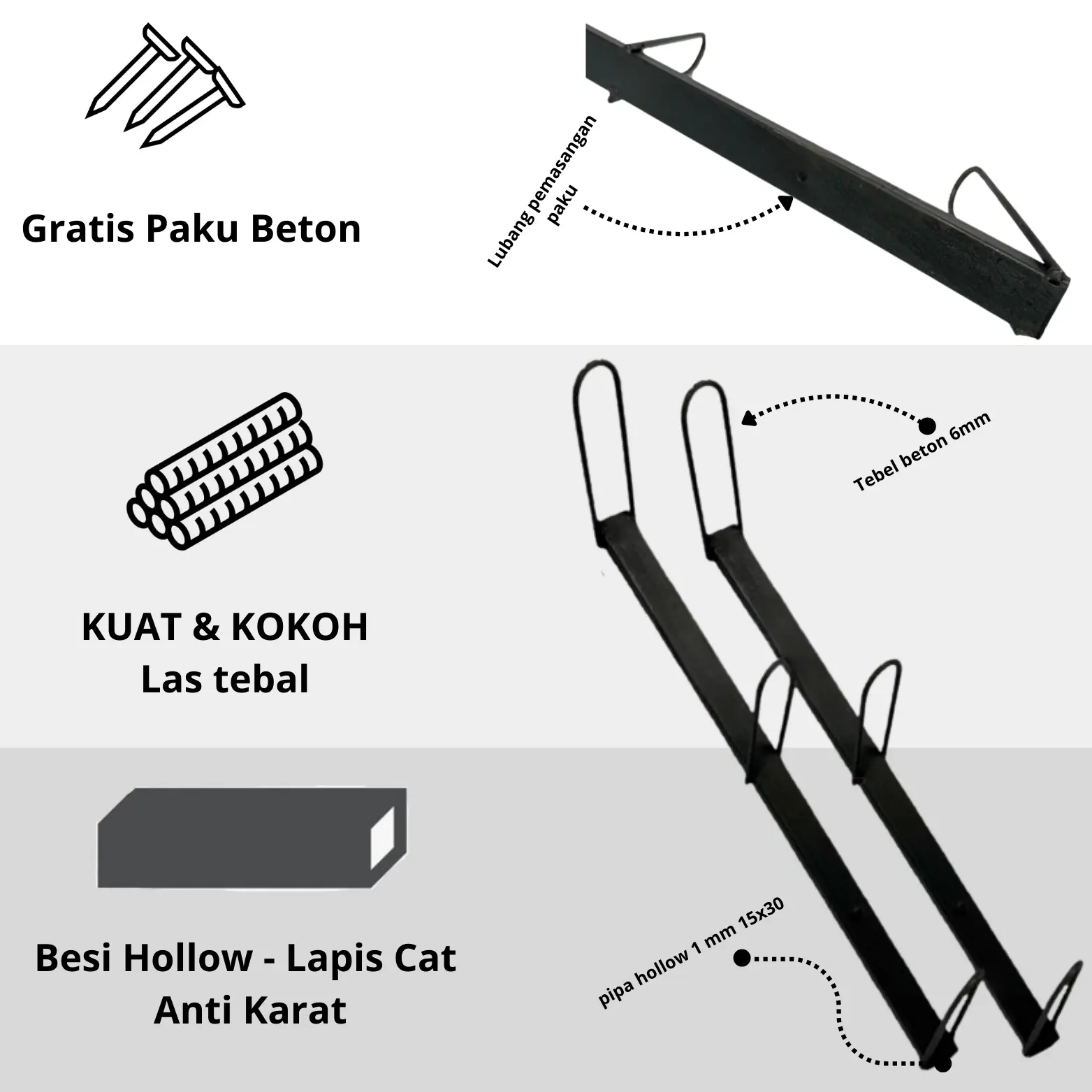• Material Besi Hollow Tebal – Kuat, kokoh, dan tahan lama. Anti karat & tidak mudah bengkok.