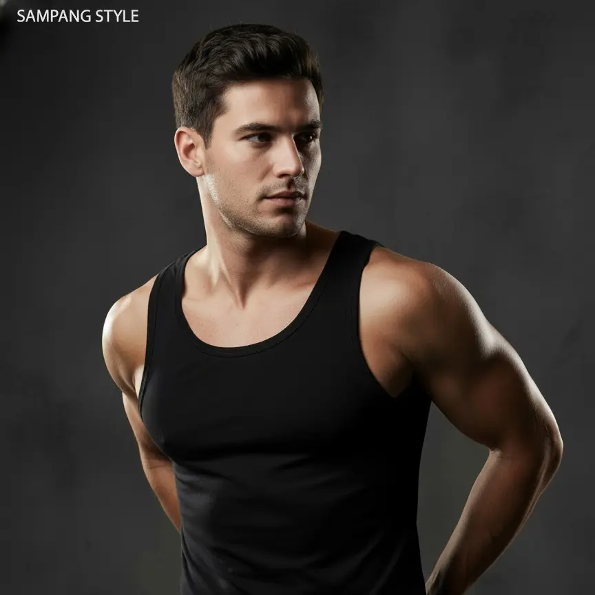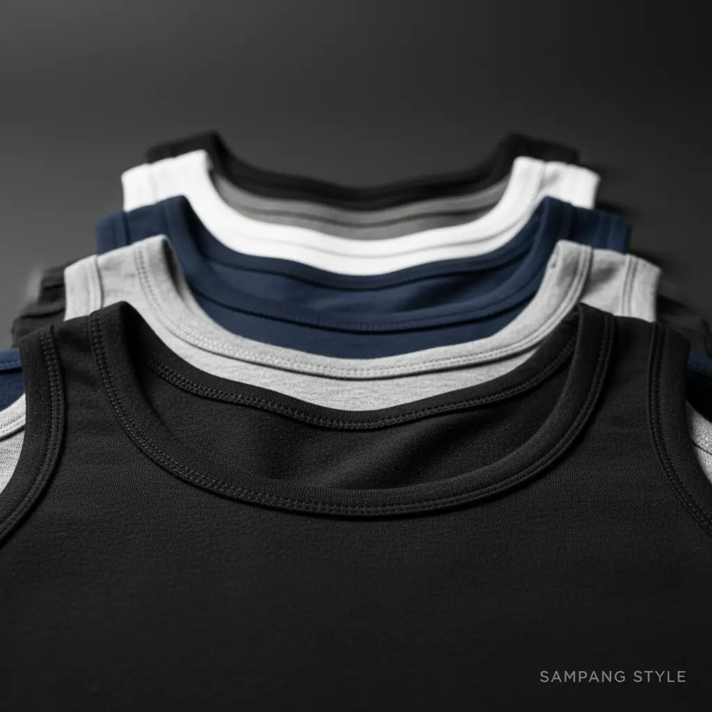 Singlet pria polos dengan desain simpel dan nyaman, cocok digunakan sebagai kaos dalam maupun dipakai harian di rumah atau aktivitas ringan.