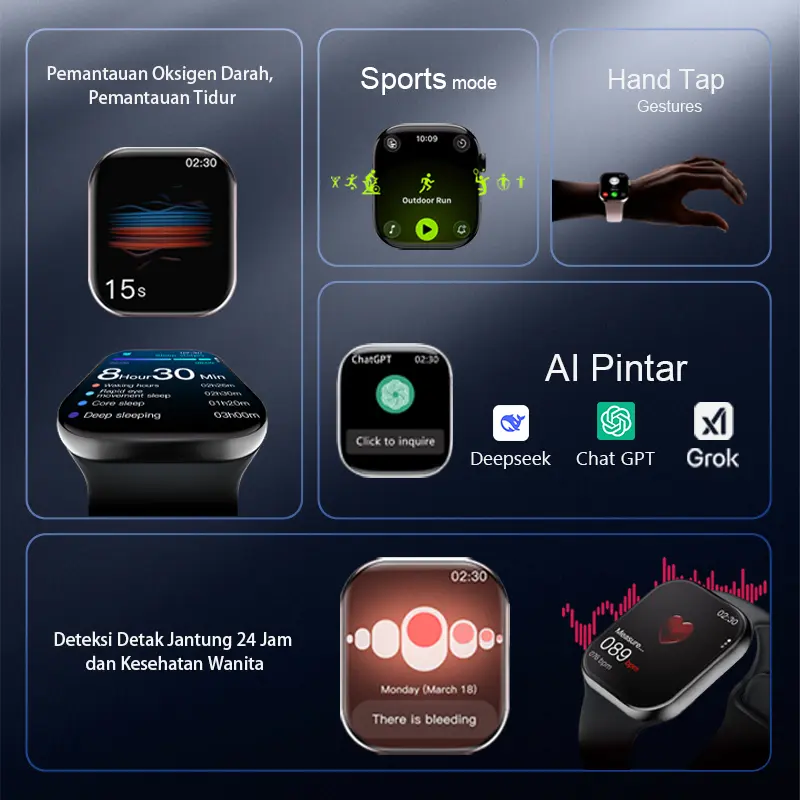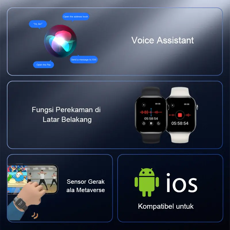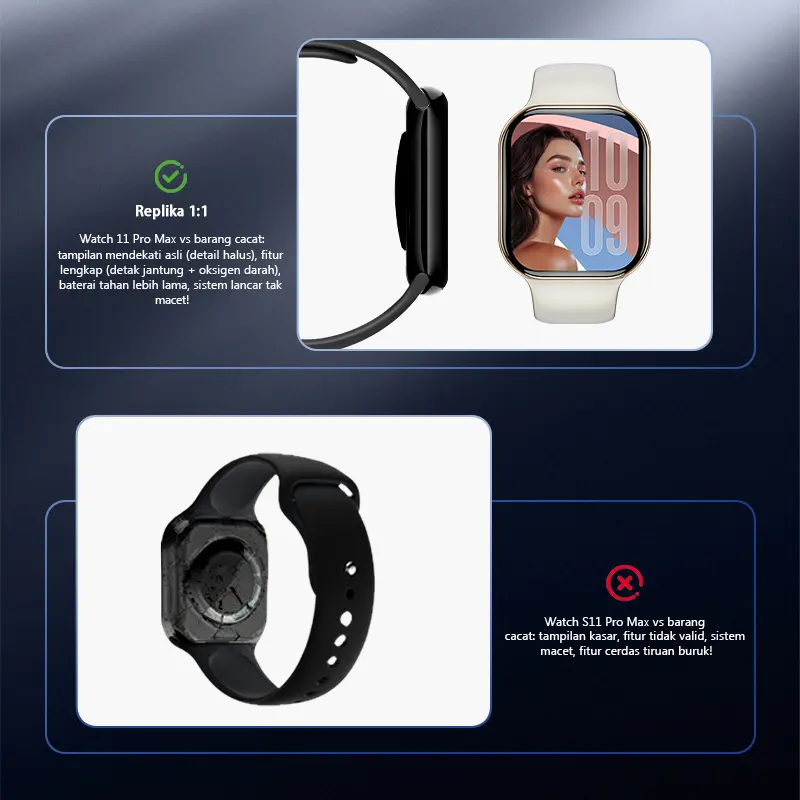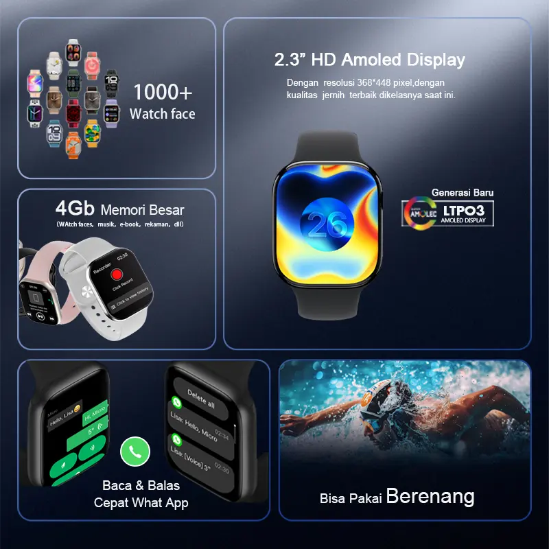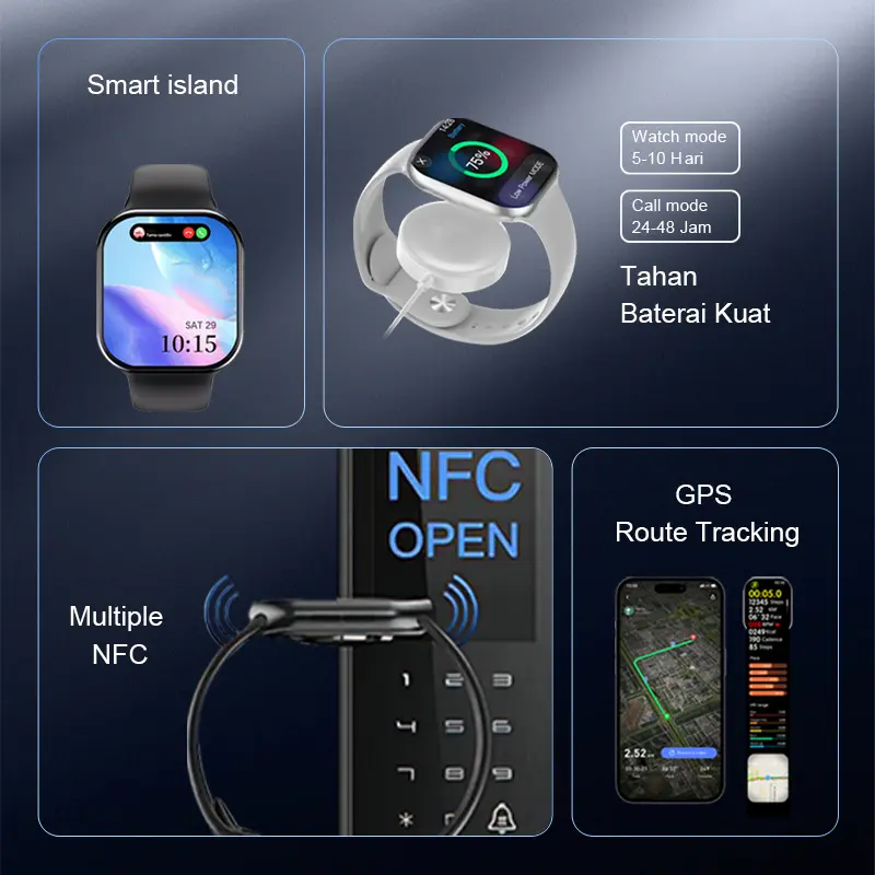Smart Watch 11 Pro Max Original - Solusi Gaya Hidup Aktifmu Cari smartwatch stylish dan penuh fitur? Ini jawabannya! Layar AMOLED 2.2" memberikan visual memukau, interface navigasi lancar responsif.NFC untuk bayar belanja di mana saja dengan cepat, GPS built-in bantu track lokasi saat outdoor—hidup lebih praktis tanpa ribet.Tahan air, aman dipakai saat berenang atau hujan, cocok untuk kamu yang suka aktivitas outdoors. Panggilan Bluetooth dan pengisian nirkabel bikin sehari-hari lebih mudah—jawab panggilan tanpa ambil hp, isi daya tanpa kabel.Desain unisex cocok untuk pria dan wanita, cocok dipakai kapan saja, di mana saja. Dapatkan wallpaper gratis eksklusif jika order sekarang! Produk original berkualitas, garansi produk, layanan pelanggan responsif. Stok terbatas, buruan pesan!