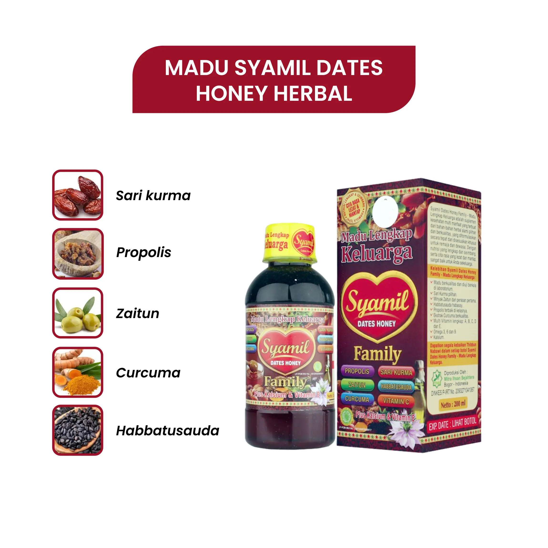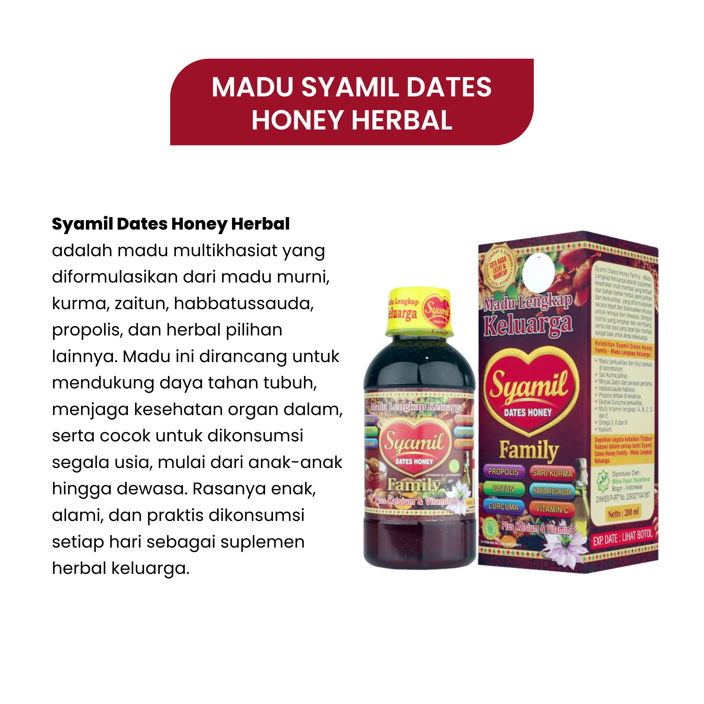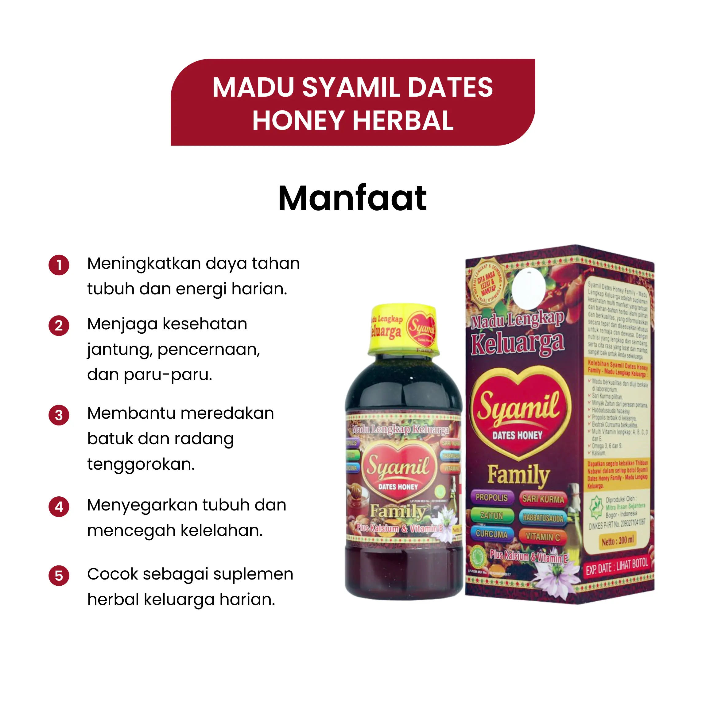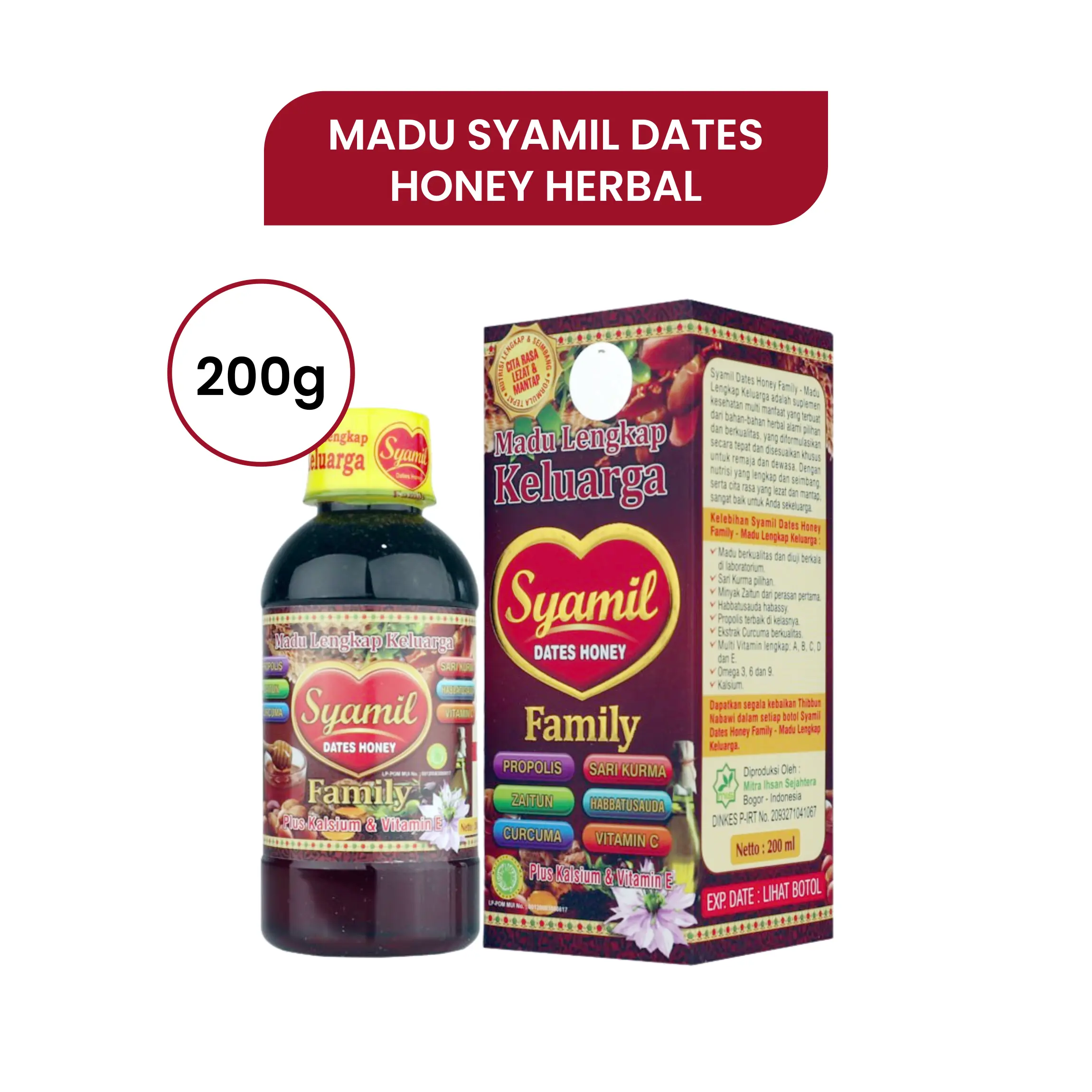 Syamil Dates Honey Family - Madu Lengkap Keluarga adalah suplemen kesehataan multi manfaat yang terbuat dari bahan-bahan herbal alami pilihan dan berkualitas, yang diformulasikan secara tepat dan disesuaikan khusus untuk remaja dan dewasa. Dengan nutrisi yang lengkap dan seimbang, serta cita rasa yang lezat dan mantap, sangat baik untuk keluarga anda.