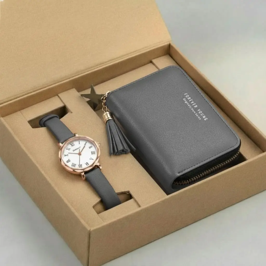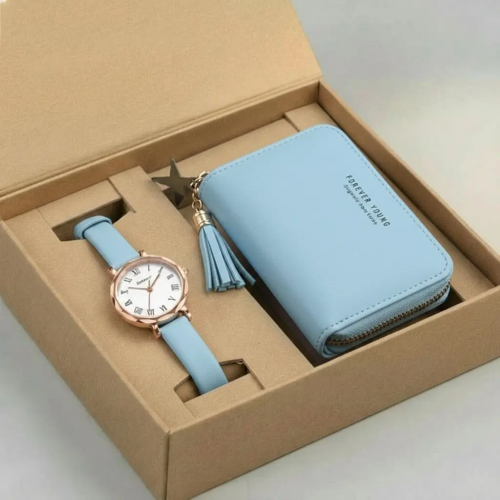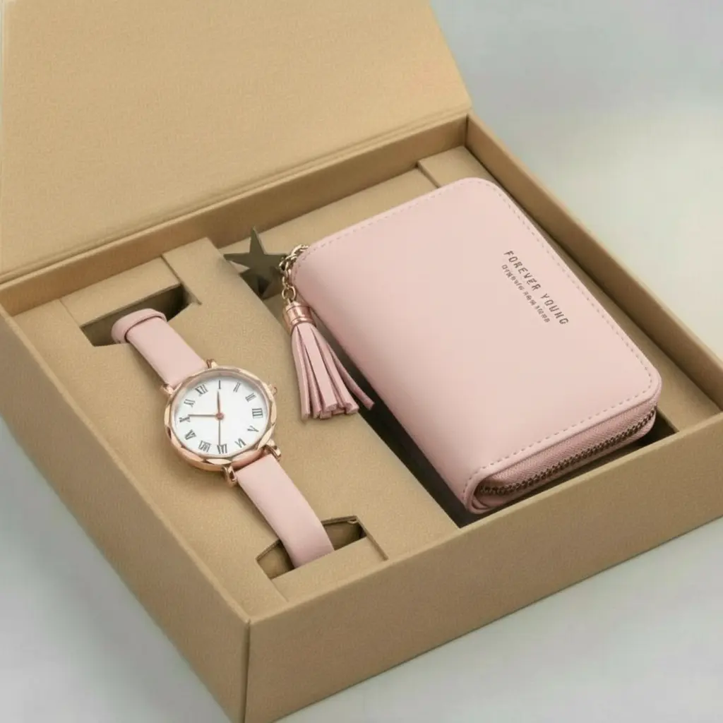 Set jam tangan wanita ini hadir dengan desain elegan bernuansa rose gold yang dipadukan dengan tali Multi Warna lembut, memberikan kesan mewah dan feminin. Dilengkapi dompet Seirama dengan jam premium dengan detail gantungan yang manis, set ini memancarkan gaya modern yang cocok untuk segala suasana — baik formal maupun kasual. Jam tangan analog dengan angka romawi menonjolkan tampilan klasik nan elegan, sementara dompet kulitnya memiliki banyak slot kartu dan ruang uang yang praktis digunakan sehari-hari. Dikemas dalam box eksklusif berwarna coklat, set jam tangan wanita + dompet ini sangat ideal dijadikan hadiah ulang tahun, hari jadi, atau kado spesial untuk orang tercinta.