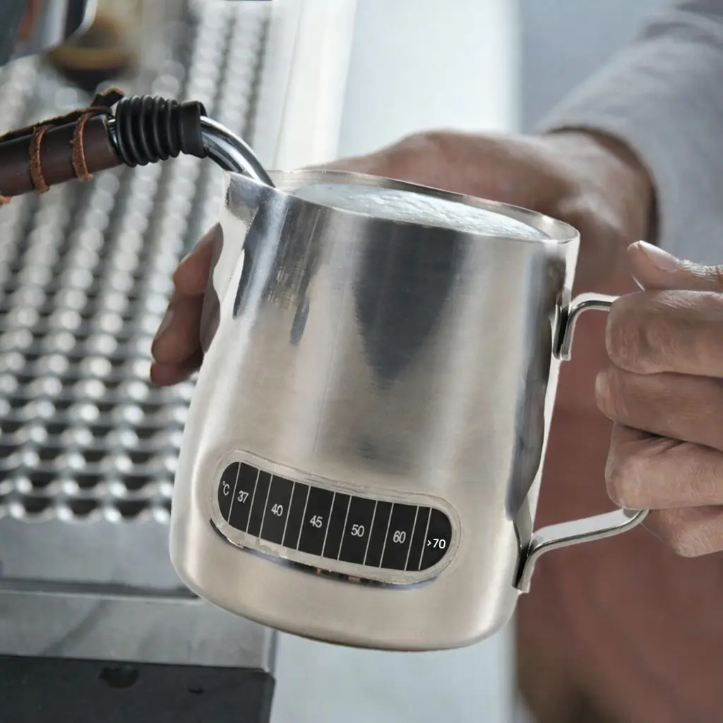 Dengan suhu yang pas, kopi yang Anda sajikan akan terasa nikmat. Itulah mengapa gelas milk jug ini dibekali dengan bar termometer pada bagian sampingnya. Anda dapat memantau dan memastikan suhu cairan sebelum dituangkan.