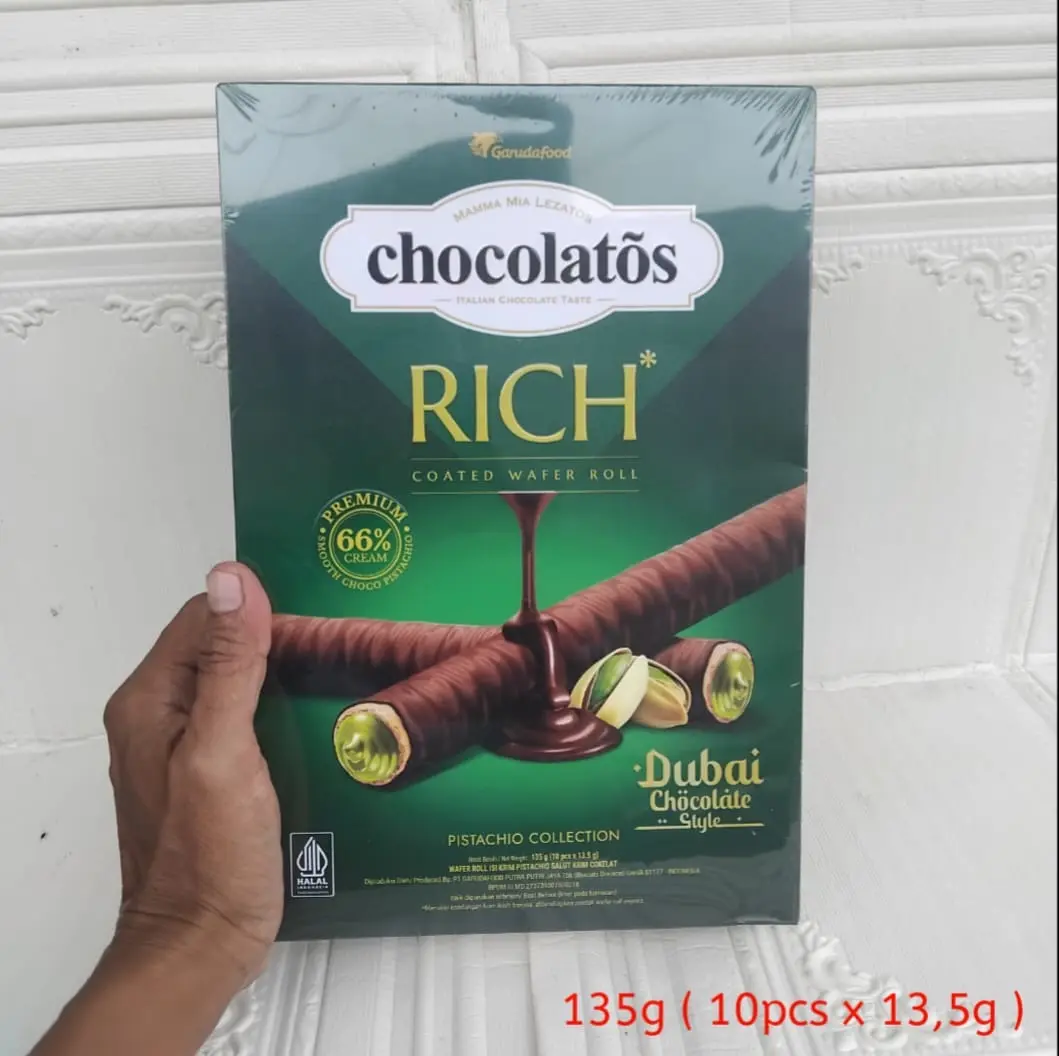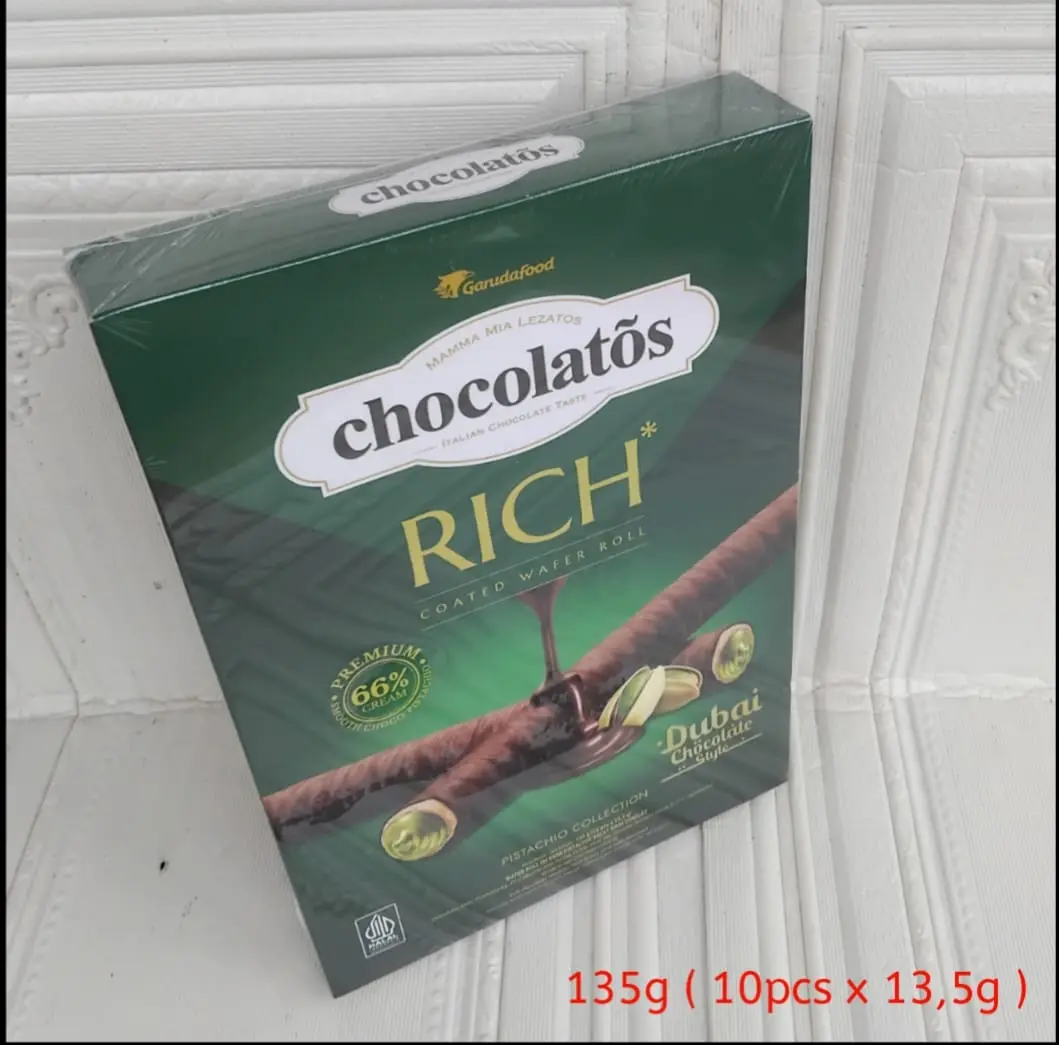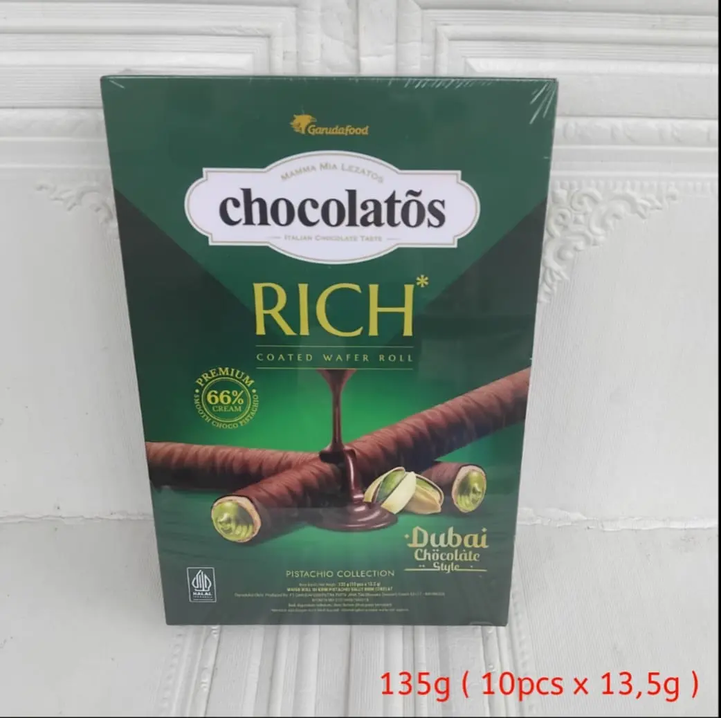 Chocolatos Rich Dubai 135gr Isi 10pcs | Chocolatos Wafer Roll Rich Dubai Chocolate Pistachio