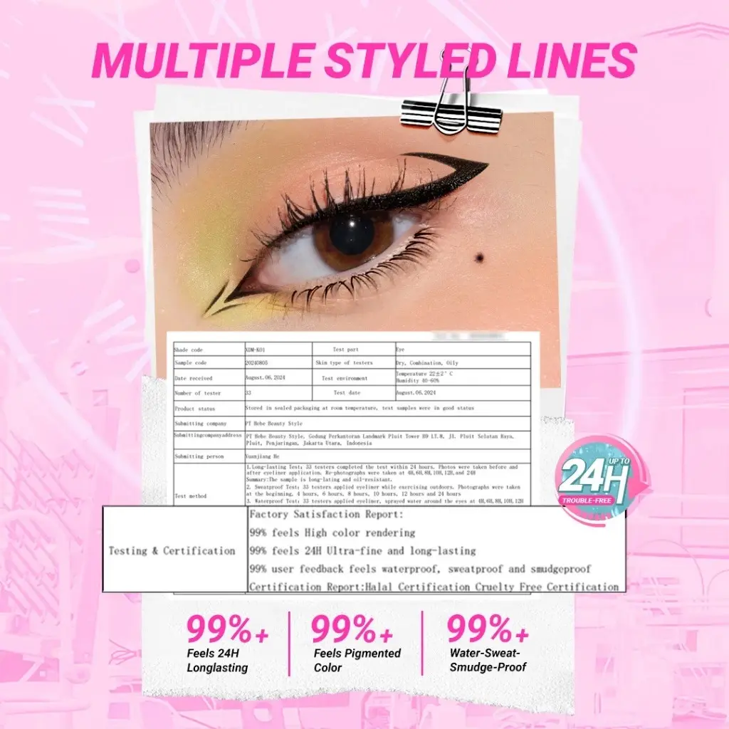 Diformulasikan dengan Dual-Ink pigmen menghasilkan warna hitam pekat yang waterproof, sweatproof dan smudgeproof untuk hasil garis yang tahan lama hingga 24 jam