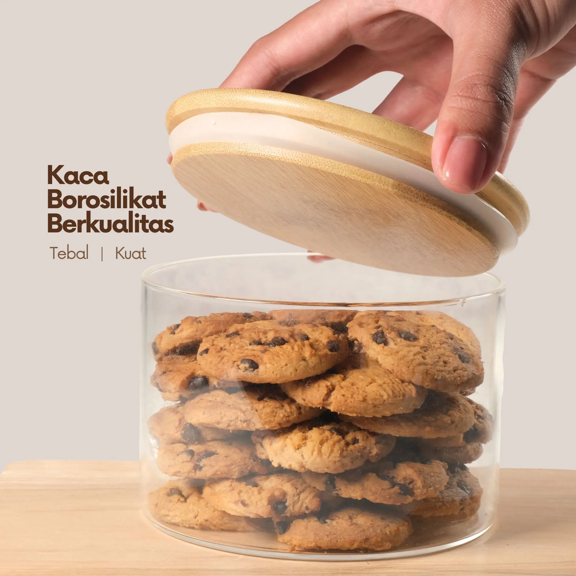 Tutup kayu pada toples ini tak hanya menambah kesan alami dan estetik, tapi juga menjaga kualitas makanan. Bagian ujungnya diberi segel karet silikon untuk mencegah udara masuk sehingga makanan tetap renyah dan tidak mudah melempem.