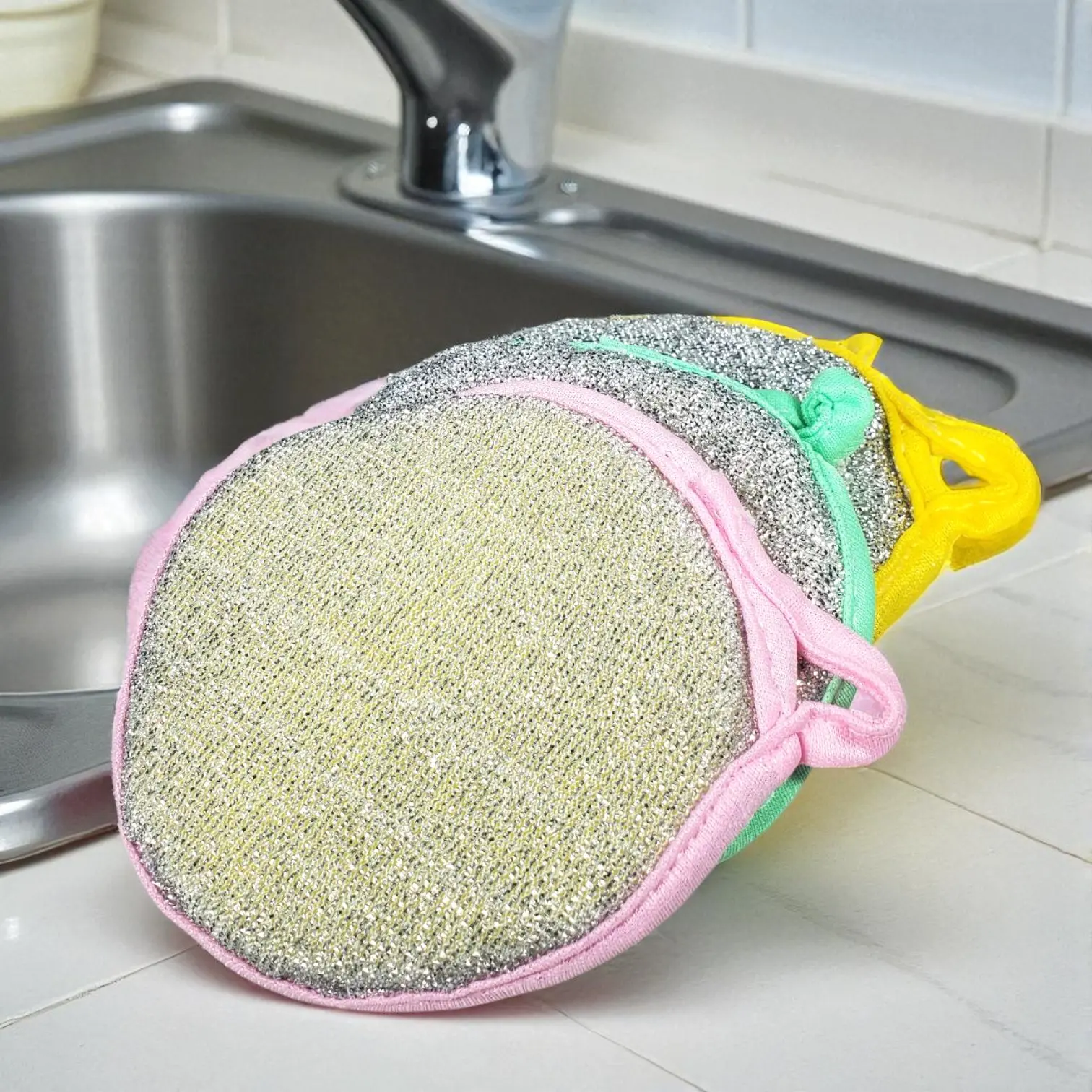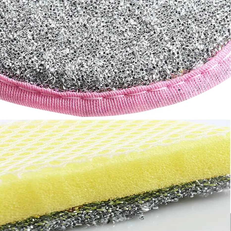Satu sisi memiliki tekstur lembut yang cocok untuk mencuci gelas kaca dan piring keramik. Sisi lainnya lebih kasar, ideal untuk menghilangkan noda membandel pada wajan dan panci. Kombinasi ini memastikan semua peralatan dapur bersih tanpa risiko goresan atau kerusakan.