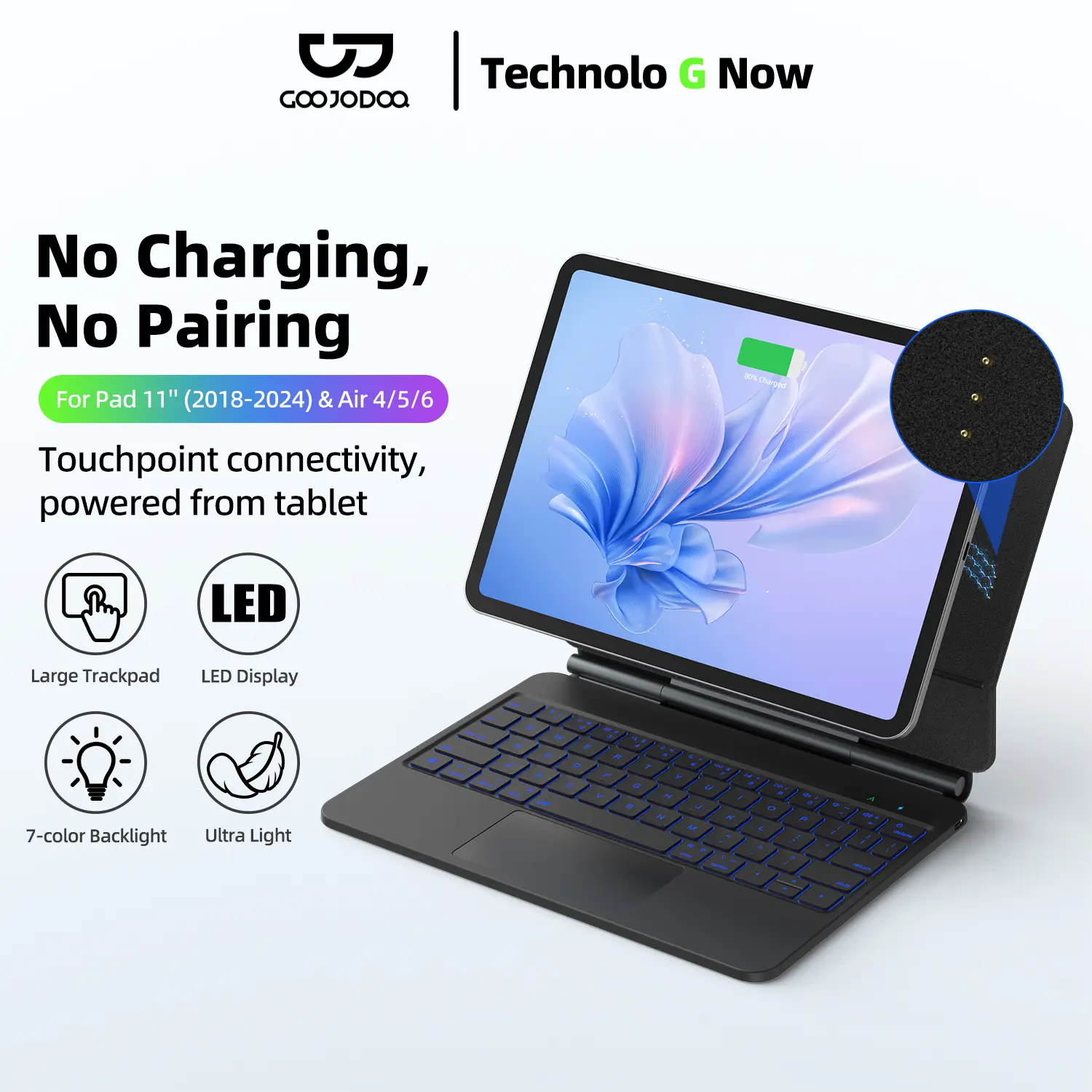 Instant Direct Connection: Connects directly to your tablet via the smart connector instead of Bluetooth for a stable, lag-free typing experience. No pairing needed, start working instantly anytime. Powered directly by your tablet, this keyboard case requires no separate charging. Besides, there is also a Type-C port for long sessions, ensuring continuous performance.