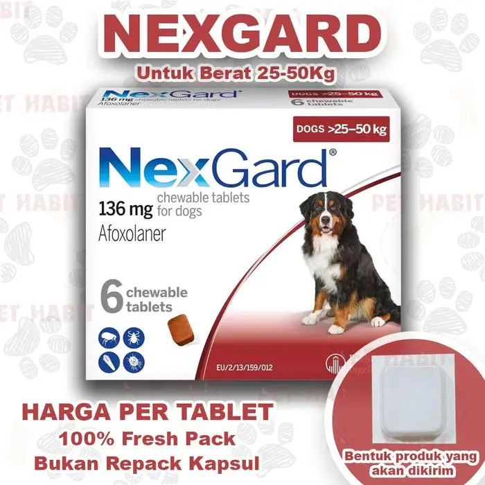 Dengan NexGard Chewables untuk Anjing, Anda akhirnya bisa memberikan teman berbulu Anda kelegaan yang mereka butuhkan dari kutu dan caplak yang mengganggu. Tidak hanya kunyahan lunak ini beraroma daging sapi yang pastinya menarik buat anabul kesayangan anda, tetapi juga bekerja keras untuk mencegah dan mengobati infestasi kutu, serta mengendalikan berbagai jenis caplak. Dan bagian terbaiknya? Tidak ada lagi aplikasi yang berantakan atau semprotan berminyak!Membunuh kutu dewasa sebelum mereka sempat bertelurBertahan selama satu bulan penuh, memberikan perlindungan yang tahan lamaDiperuntukkan bagi anjing dan anak anjing berusia 8 minggu atau lebih, dengan berat setidaknya 2kgMengendalikan infestasi caplak , kutu anjing American, kutuLone Star, kutu Brown Dog, dan tipe kutu lainnyaBentuk kunyahan yang mudah diberikan membuat dosis menjadi lebih mudah. Diberikan sebagai camilan ataupun dicampur di makanan (namun pastikan bahwa obat termakan habis)Beraroma daging sapi yang lezat untuk camilan yang akan disukai anjingObat kutu anjing paling ampuh saat ini sekaligus paling aman untuk liver dan ginjal. Proteksi total terhadap kutu selama 1 bulan penuh.Sangat ampuh membasmi semua jenis kutu sampai ke telur dan larvanya. Kutu hilang dan mati dalam waktu maksimal 1x24 jam setelah konsumsi obat.Juga ampuh untuk mengobati demodex pada anjing. Demodex akan mulai mengering dalam waktu 1 minggu setelah konsumsi obat.Untuk kasus kutu, apabila sudah tidak berkutu lagi maka tidak perlu diulang pemberiannya (hanya 1 bulan sekali BILA DIBUTUHKAN SAJA).WAJIB Diperhatikan:- Mohon ditanyakan ketersediaan stock sebelum berbelanja- Sediakan Video Unboxing untuk melakukan Komplain apabila ada kerusakan produk tanpa CUT (WAJIB)