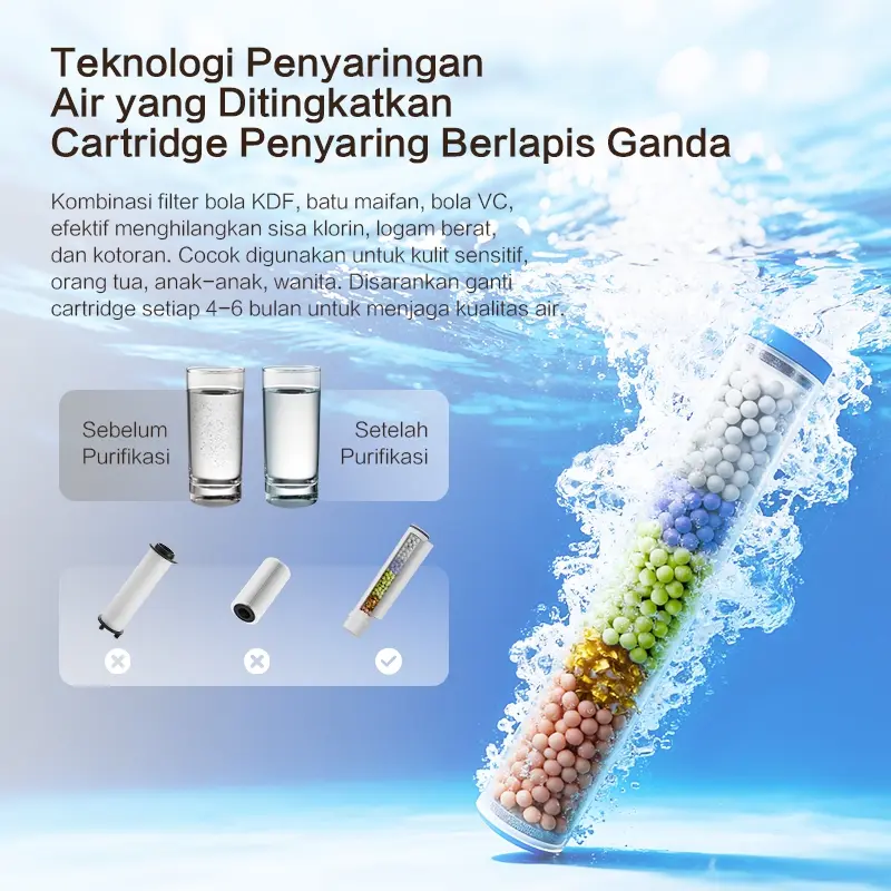 Teknologi penyaringan ganda dengan KDF, batu maifan, dan bola VC