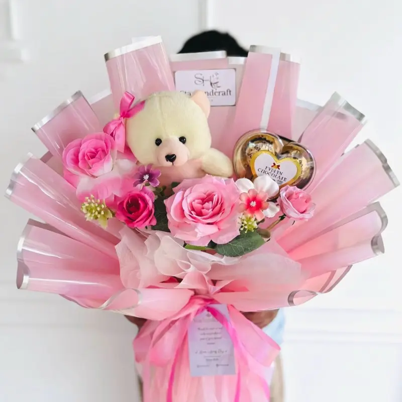 5. Buket Valentine Murah Boneka Coklat Love dengan Bunga Mawar dan Hadiah Coklat Hati