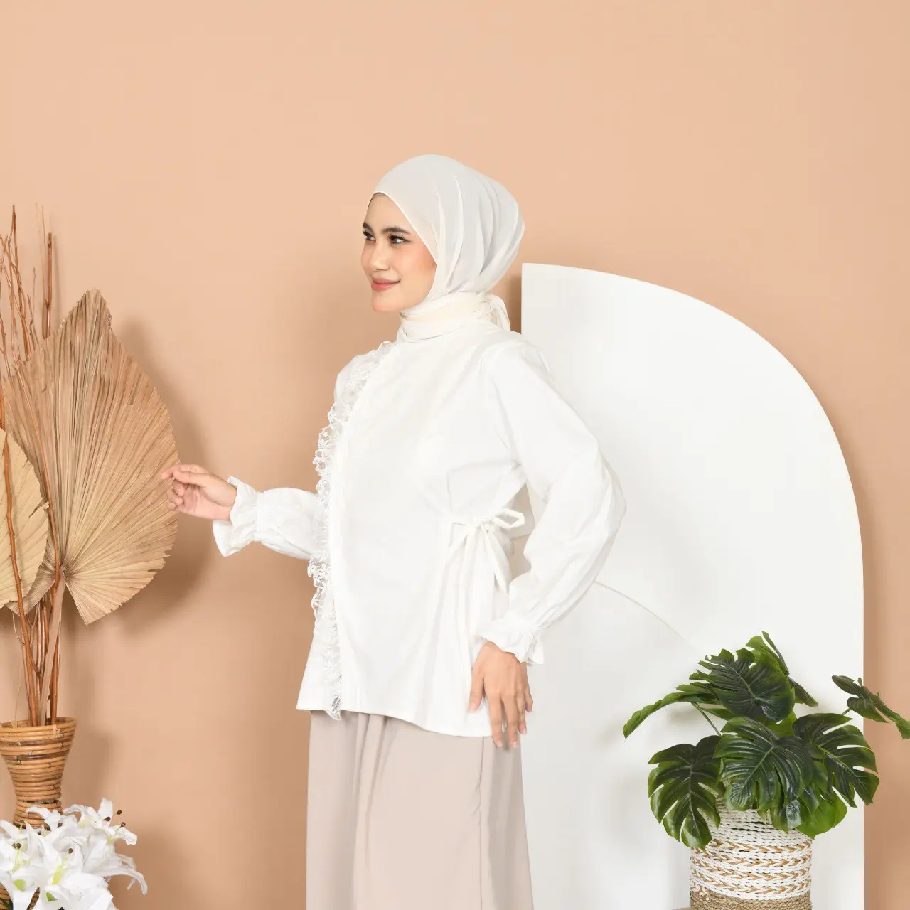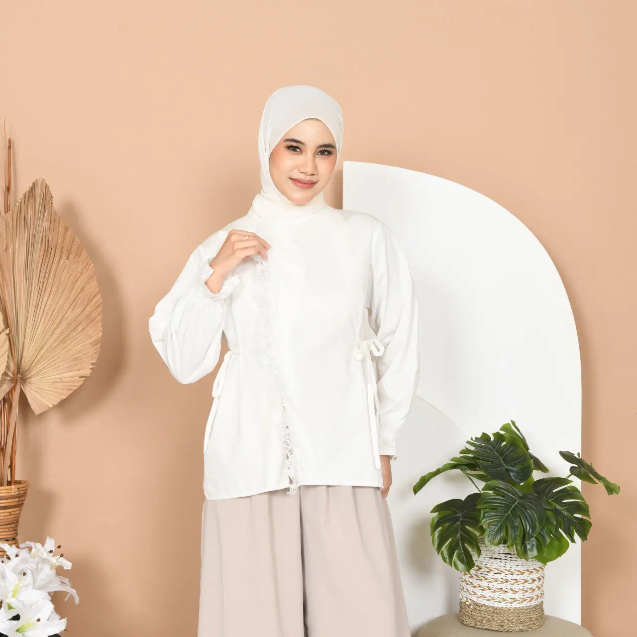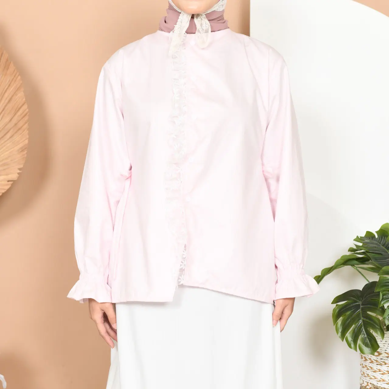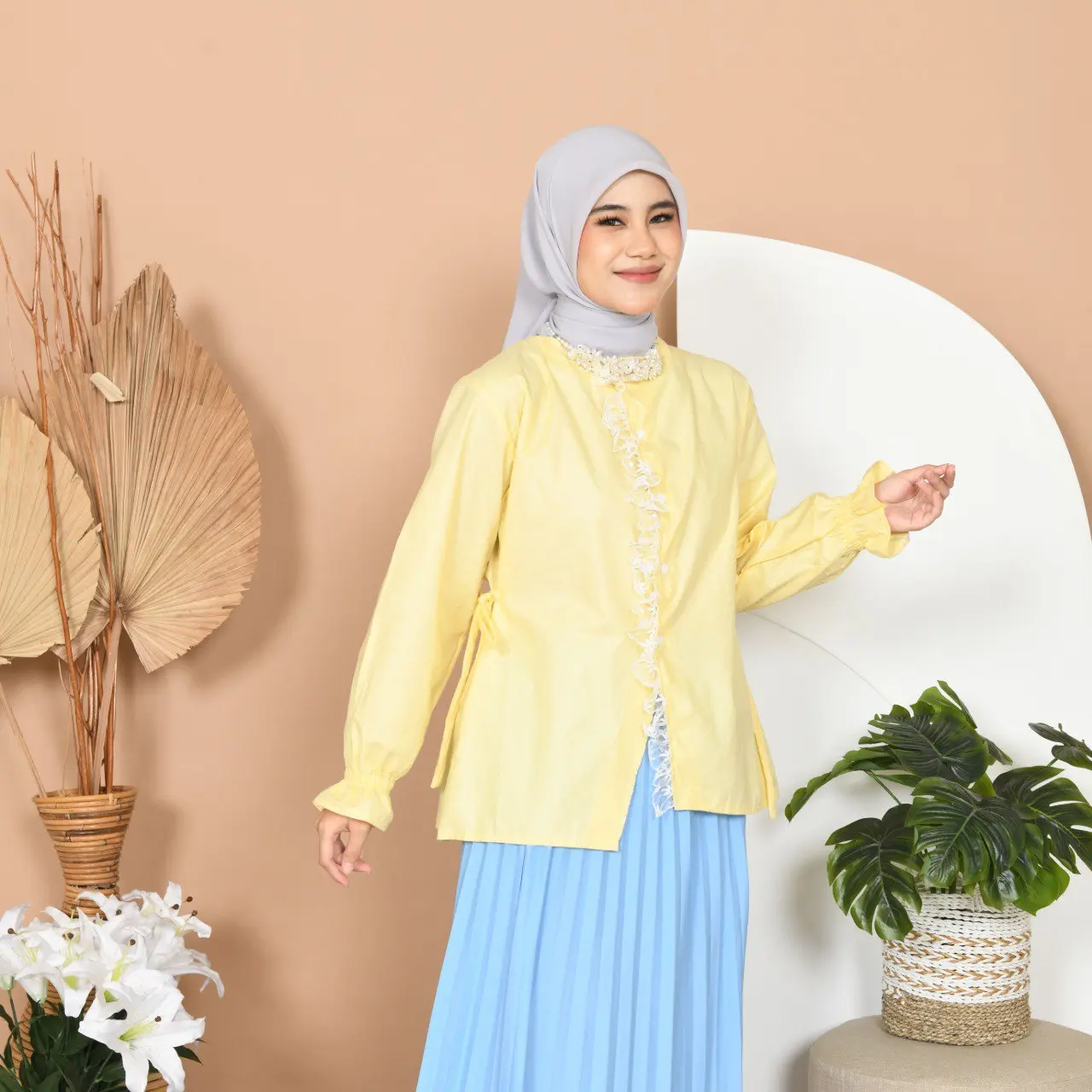 Hallo Beauty! Cari atasan yang fresh dan anggun? Blouse ini wajib Anda miliki. Detail lace vertikal memberikan kesan vintage namun tetap modern. Tali samping yang bisa di-adjust membuat tubuh lebih ramping. Pergelangan tangan dengan karet elastis tidak membuat tangan sakit. Cocok untuk acara pengajian, brunch, atau OOTD. Yuk, cek sekarang!