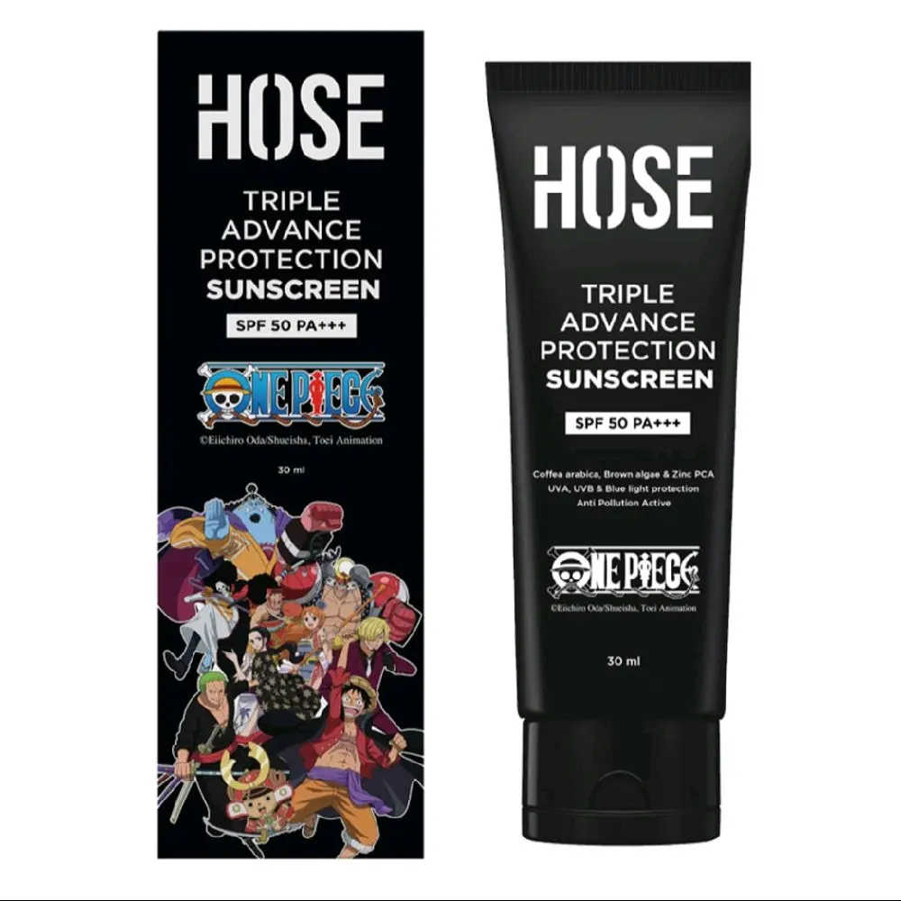 Hose x One Piece Sunscreen Wajah Pria SPF 50 30 mlĀ merupakan tabir surya yang dibuat untuk menjaga kulit wajah Anda dari paparan sinar matahari. Diformulasikan dengan Triple Advance Protection SPF 50+++ yang memberikan perlindungan kulit secara optimal. Mengandung Coffee Arabica, Brown Algae, serta Zinc PCA yang melindungi kulit wajah dari radikal bebas dan menjaga kulit tetap sehat, segar, dan tidak kusam.Ā