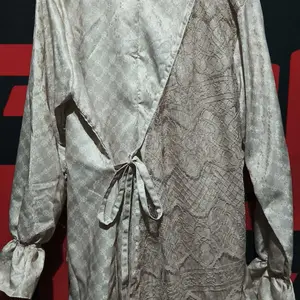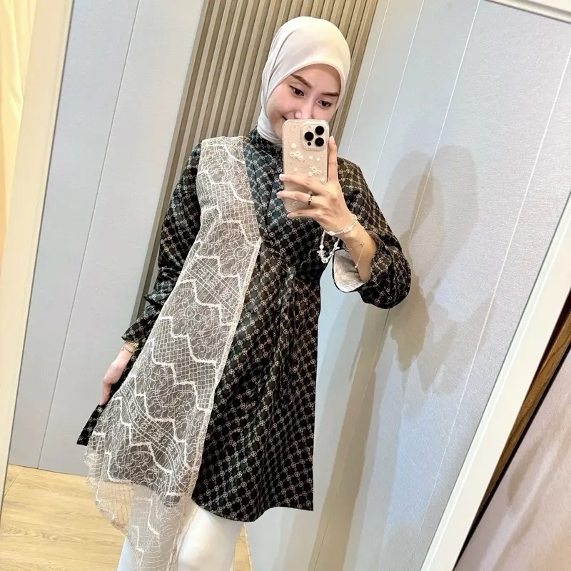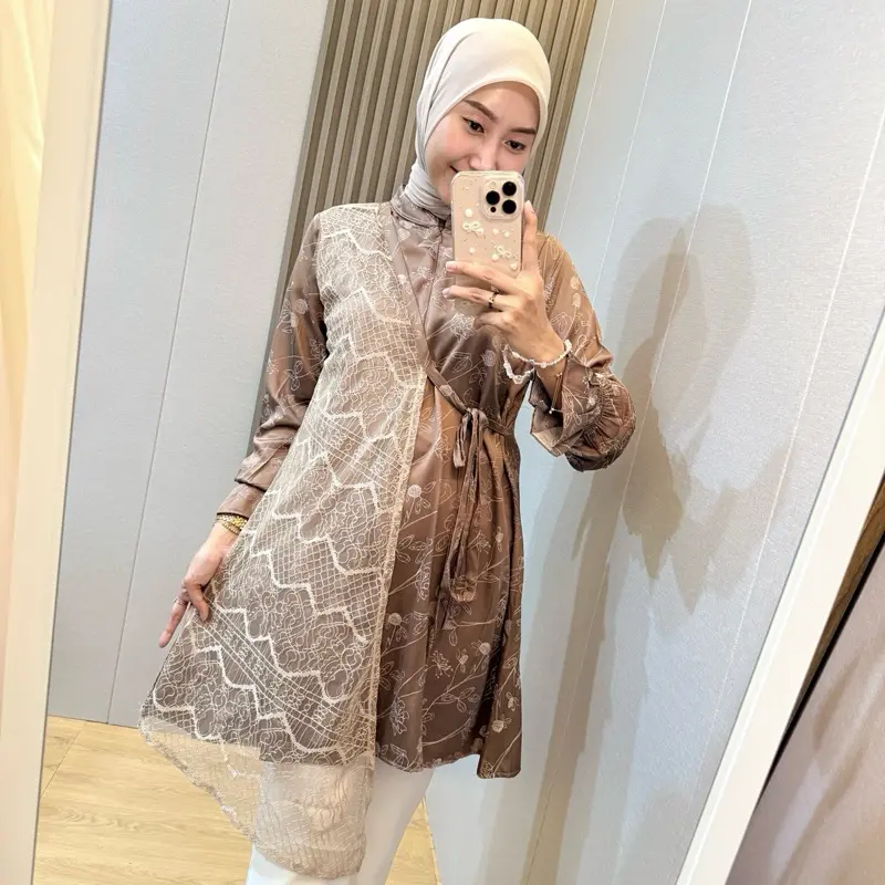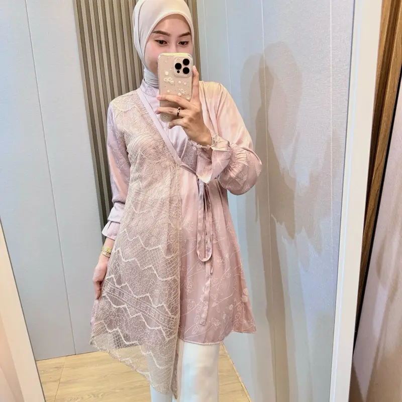 Blouse Shireen hadir dengan desain tunik modern sentuhan kimono yang dipadukan dengan aksen lace/renda cantik di bagian depan. Memberikan kesan mewah, feminin, dan classy tanpa terlihat berlebihan