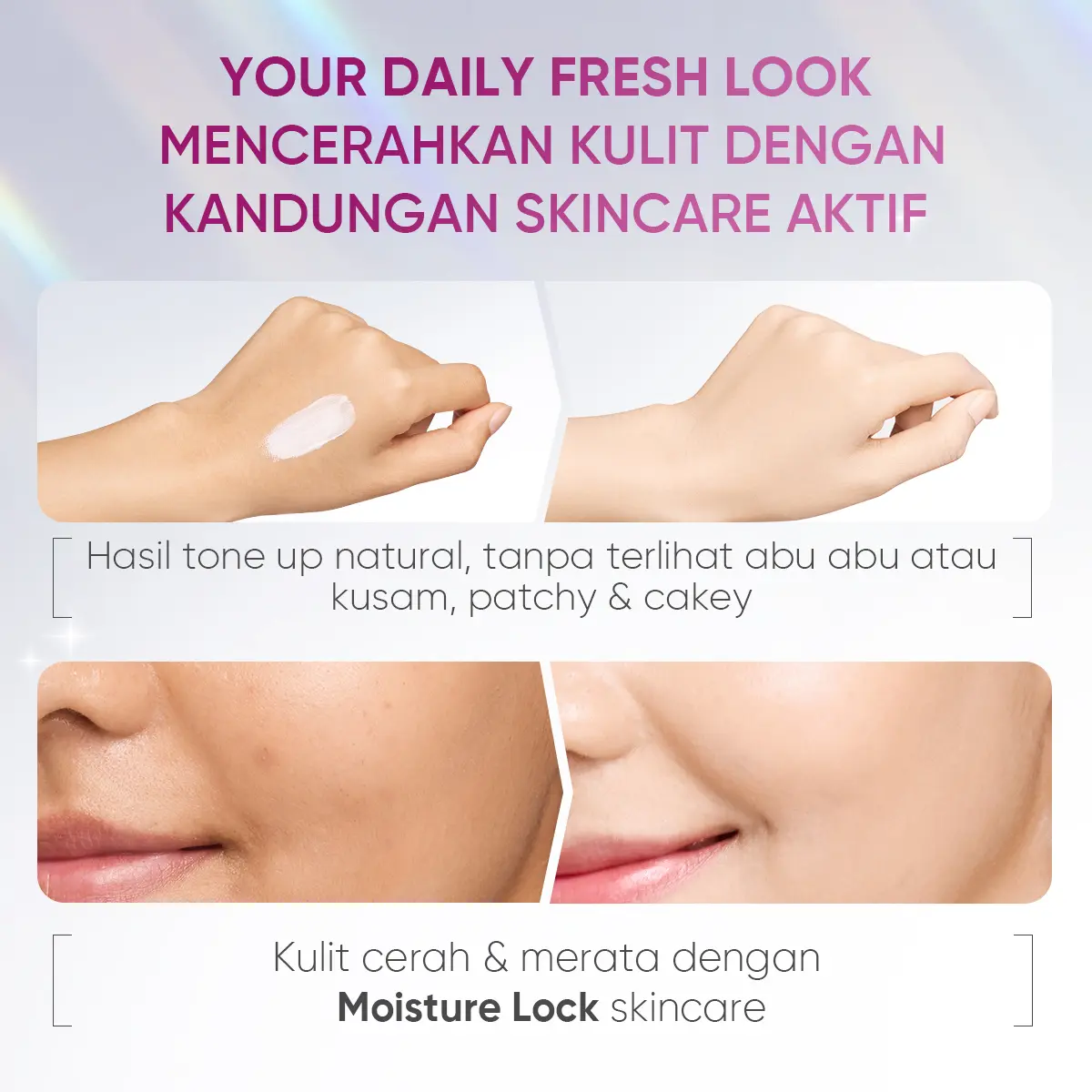 Memberikan efek tone-up instan dengan hasil cerah alami tanpa kesan abu-abu atau white cast