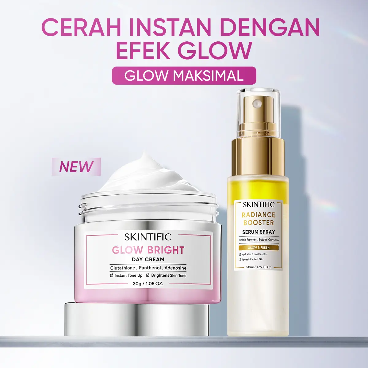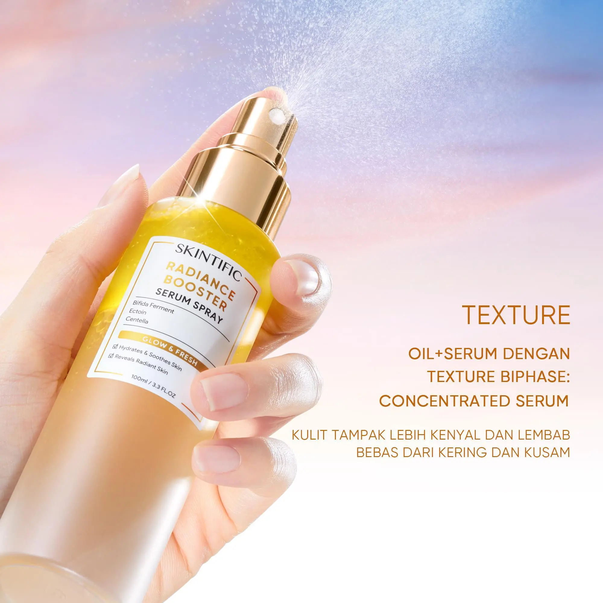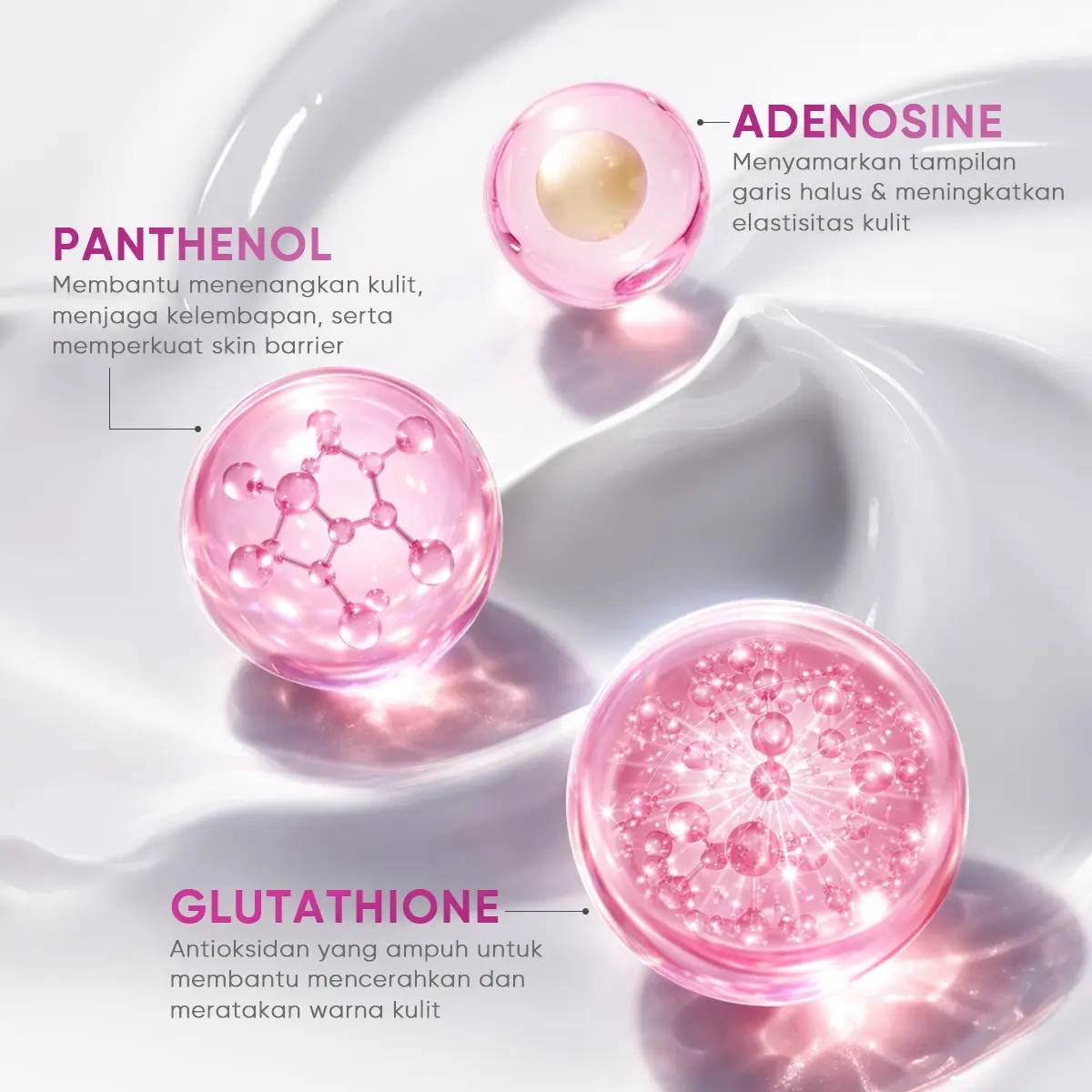 Diperkaya dengan Glutathione untuk membantu mencerahkan dan meratakan warna kulit. Panthenol membantu menenangkan kulit dan mengunci kelembapan, serta Adenosine membantu meningkatkan elastisitas kulit dan menyamarkan tampilan garis halus. Kombinasi kandungan ini membantu menjaga kulit tetap halus, kenyal, terhidrasi, dan tampak sehat sepanjang hari.