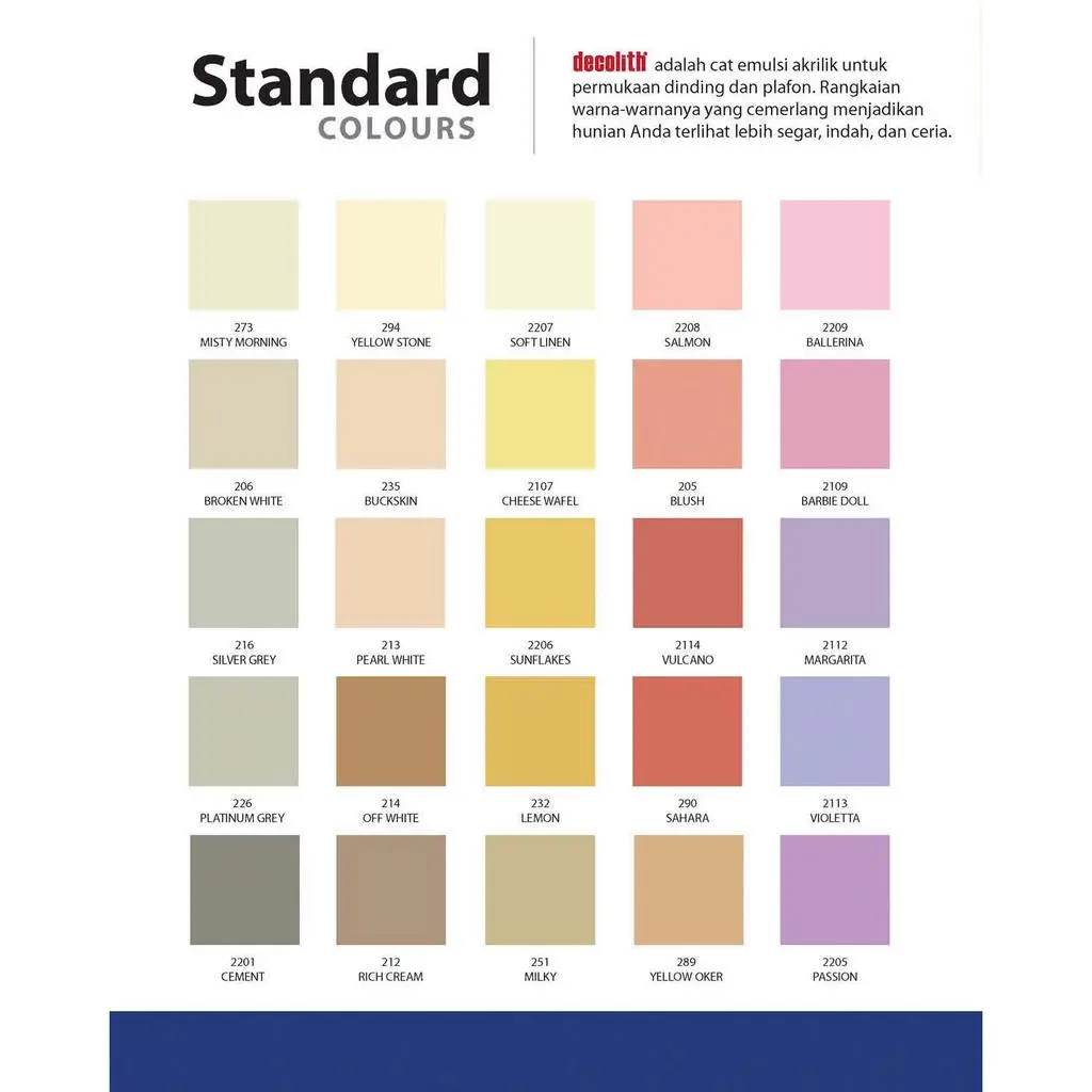 DECOLITH adalah satu-satunya cat tembok dan plafon yang berbahan dasar full acrylic di kelasnya. Ramah lingkungan karena berbahan dasar air, serta bebas timbal dan merkuri.