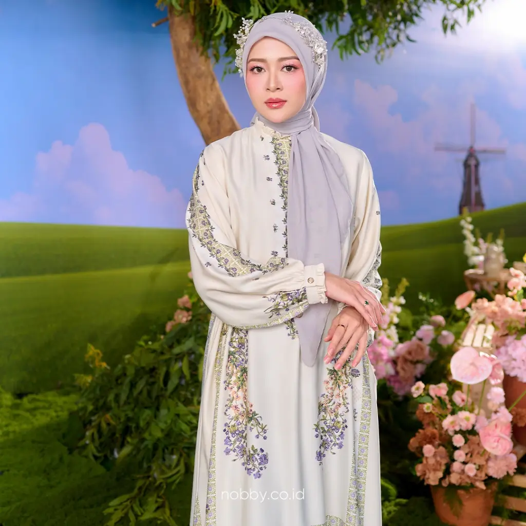 Nobby Seroja Dress Gamis Wanita Muslim Lengan Panjang Wanita Floral Pattern Bahan Light Satin Silk