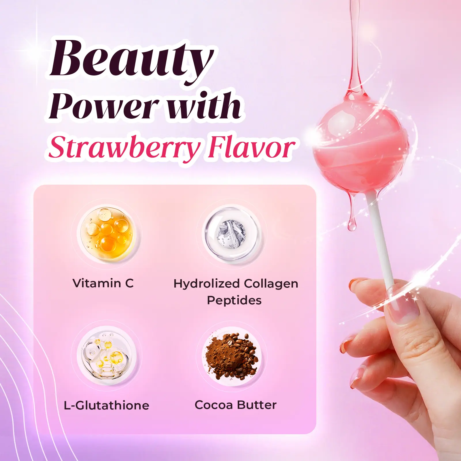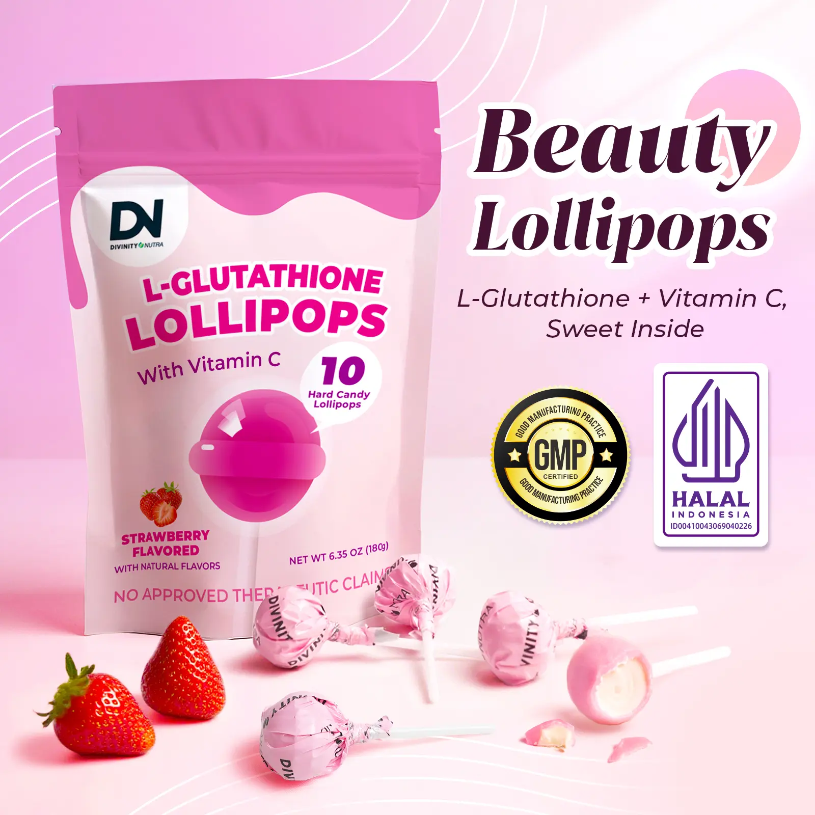 C+Collagen L-Glutathione Permen Lolipop with Vitamin C - 10 Batang, untuk Kesehatan Kulit dan Glowing,Hydrolyzed Collagen Peptides dengan Vitamin C, Stroberi,Hadiah untuk Wanita / Hadiah Istri / Hadiyah Spesial , COD | BPOM [HALAL] | Divinity Nutra