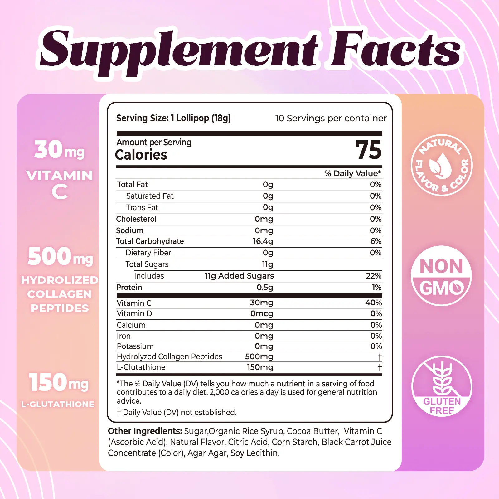 Mengandung 30mg Vitamin C untuk membantu meningkatkan kesehatan sistem kekebalan tubuh. Diperkaya 150mg L-Glutathione untuk mendukung pertahanan alami tubuh dan mencerahkan kulit.