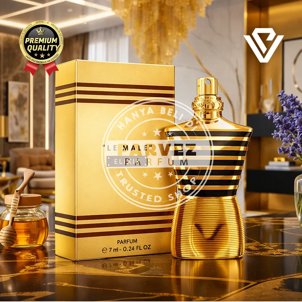 Menampilkan desain ikonik berbentuk torso pria maskulin dengan garis-garis pelaut (marinière) yang khas. Botolnya berwarna emas gelap (gold) yang elegan dan mewah dengan kaca transparan berwarna coklat/amber yang menonjolkan cairan parfum di dalamnya. Desain ini mencerminkan kesan sensual, intens, dan moder.